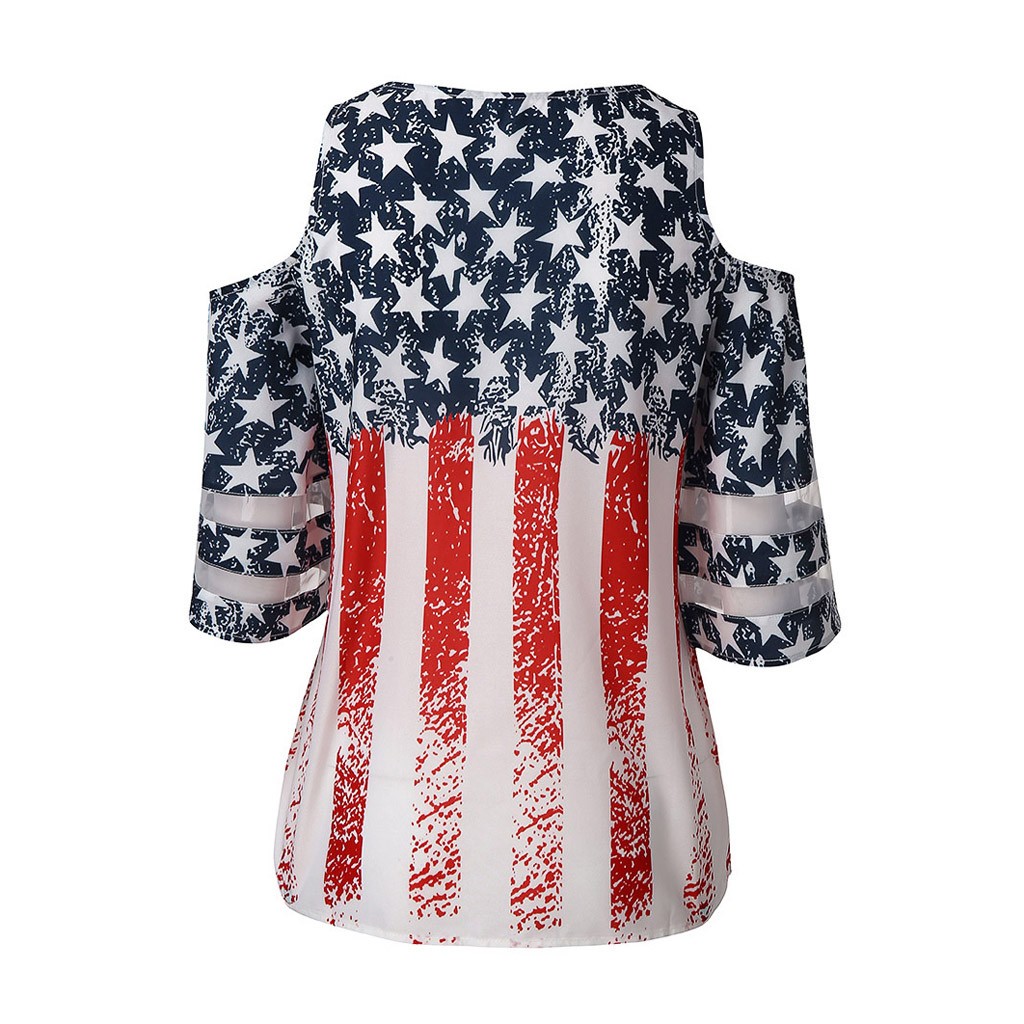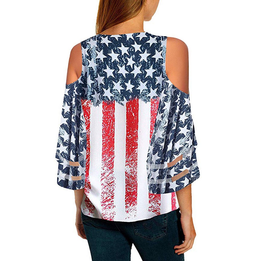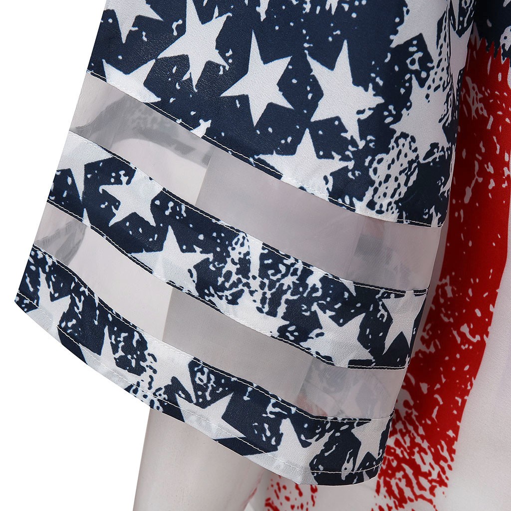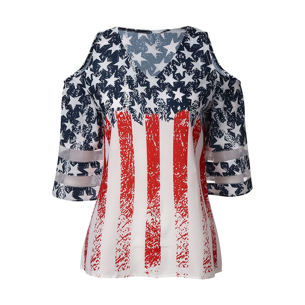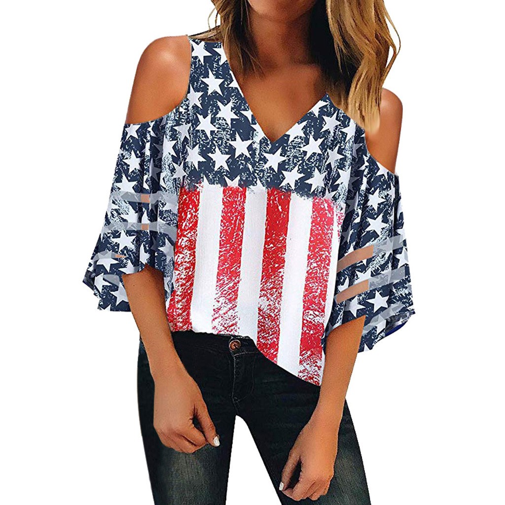 Женская сетчатая блузка с v-образным вырезом и принтом американского флага, топ с рукавами-колокольчиками 3/4