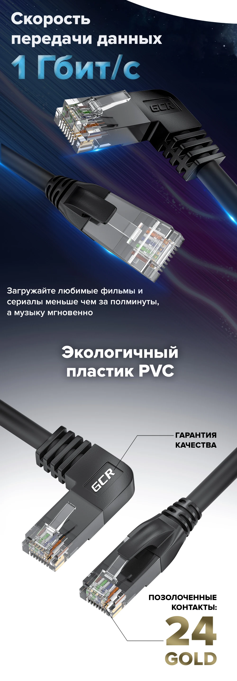 Кабель популярной категории 5е обеспечит высокоскоростной интернет 1 Гбит/с. С такой скоростью любимые фильмы будут загружаться меньше чем за полминуты, а музыка - мгновенно. Благодаря угловой форме коннектора размещайте кабель максимально комфортно и без изгибов даже в ограниченных или труднодоступных пространствах.