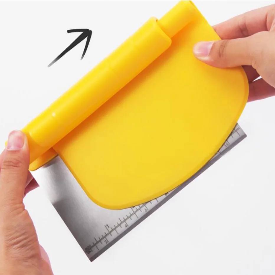 Product: 2-in-1 pastry cutter Color: yellow Material: stainless steel+ pe Function: with measurement Size: 15*11.3cm/5.9*4.45inch Use for: pastry dough cutter Package include: 1 pc pastry cutter