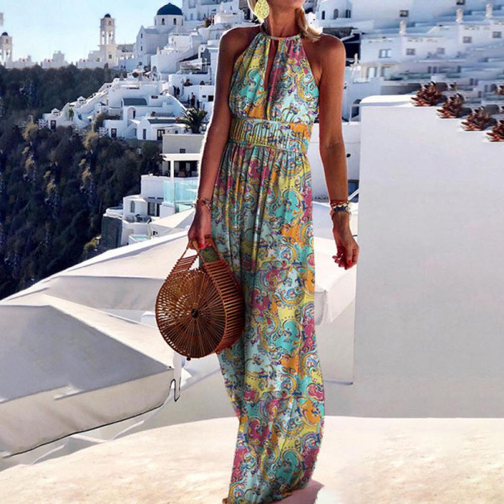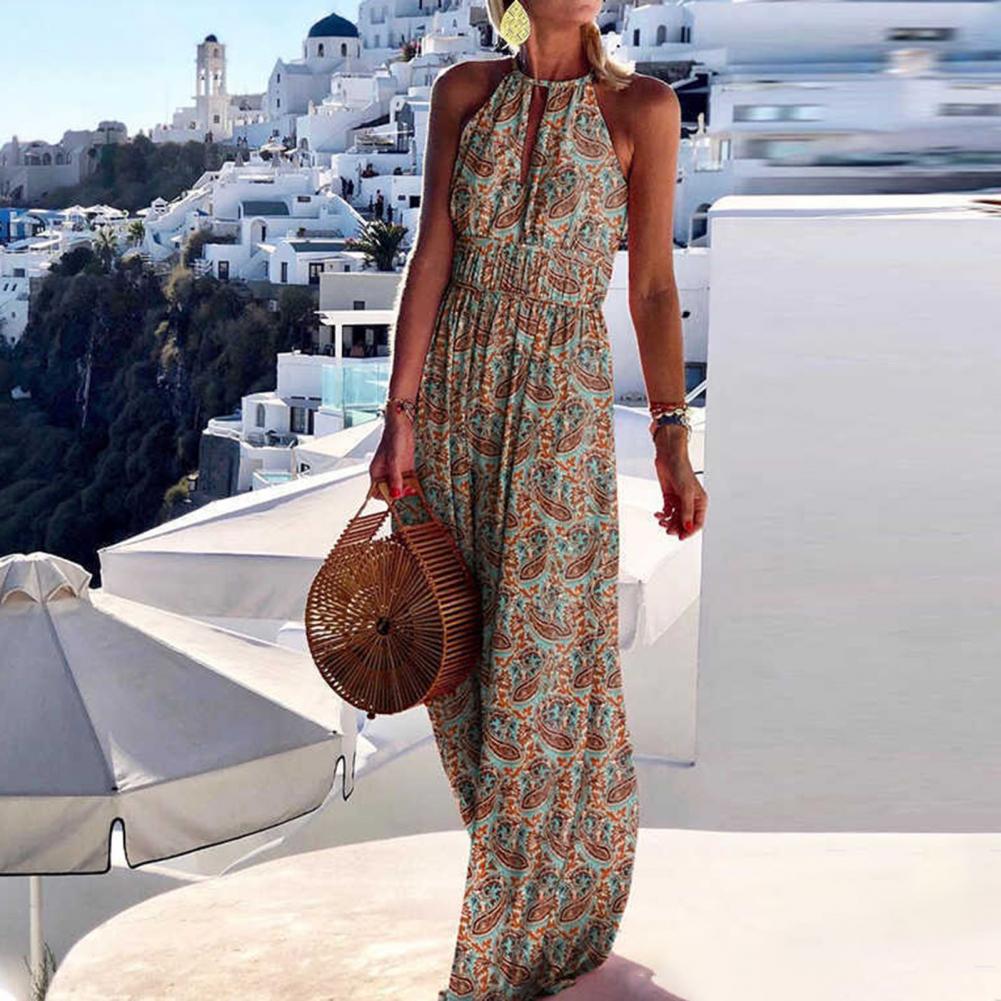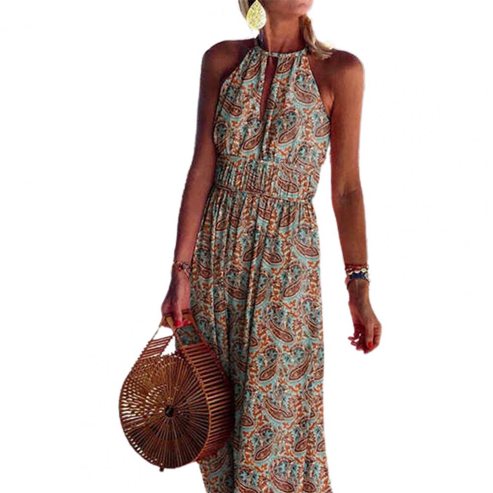 Богемное женское платье без рукавов с открытой спиной Пейсли Цветочный Принт Холтер Макси платье уличная одежда Вечерние