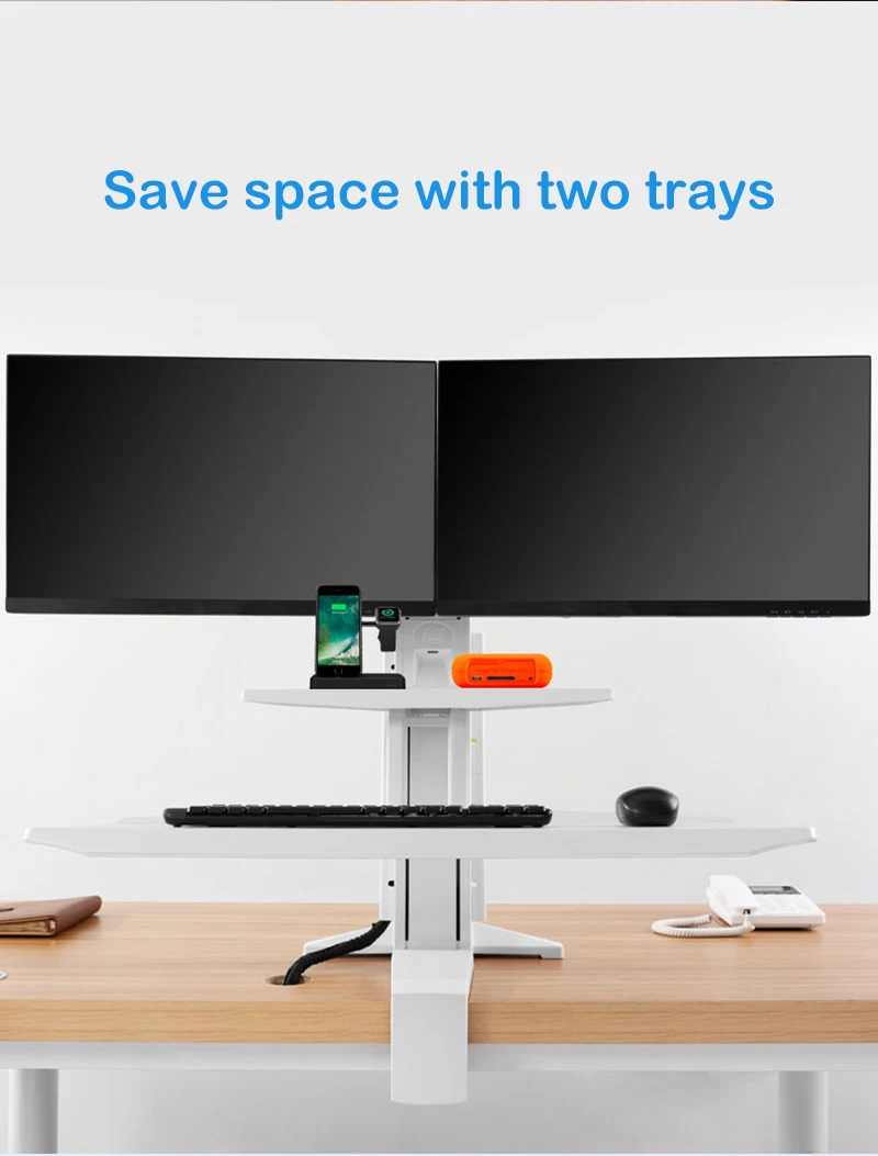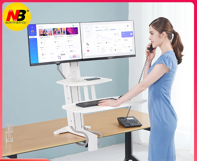 ВST35-2A dual monitor integrated sit stand workstation-это еще один новейший эргономичный продукт, разработанный и изготовленный NB, который способствует сотрудничеству и благополучию на рабочем месте. Это полностью изготовлено из алюминиевого сплава и стальных базовых материалов с большой клавиатурой стол обеспечивает вам стабильную и прочную настольную рабочую станцию.
