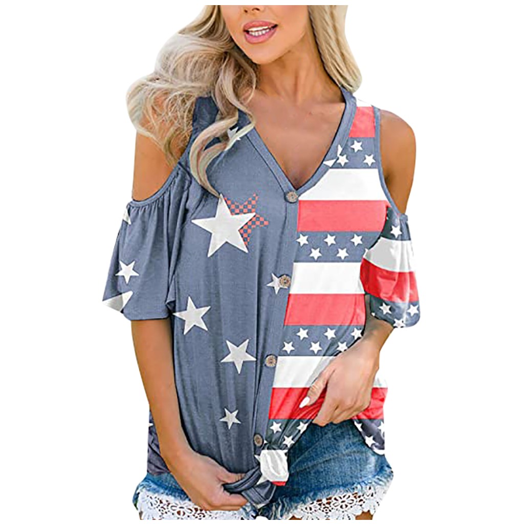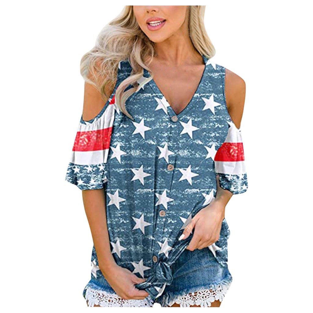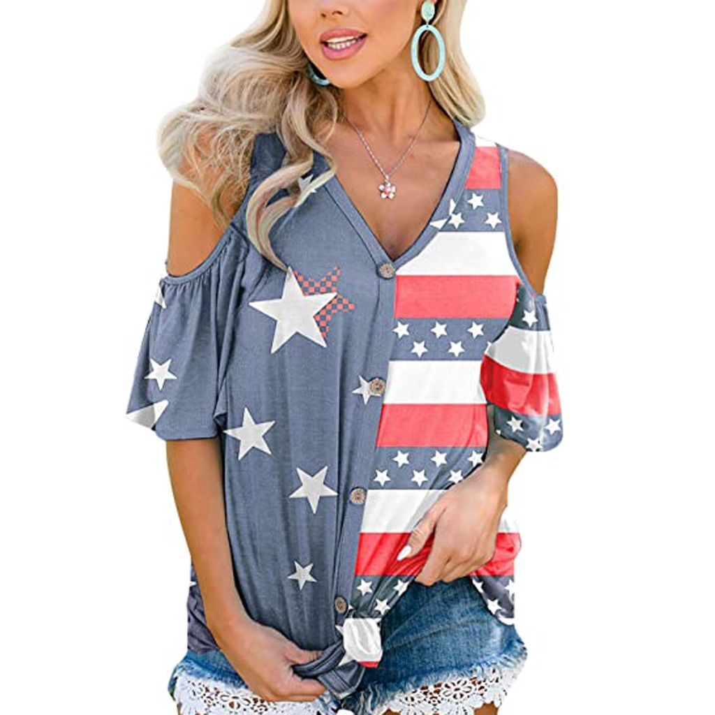 Женская патриотическая блузка в полоску с принтом звезды, американского флага, открытыми плечами и пуговицами