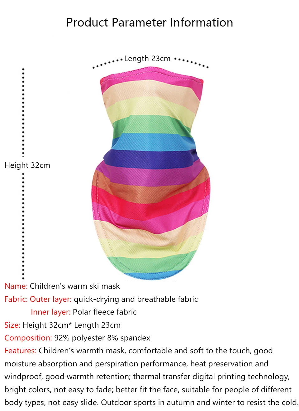 Спецификация: Название: Детская Теплая Лыжная маска Ткань: 92% полиэстер, 8% спандекс Упаковочный лист: 1 шт. * Детская Теплая Лыжная маска Примечание: Возможны отклонения на 1-2 см вследствие измерений вручную.
