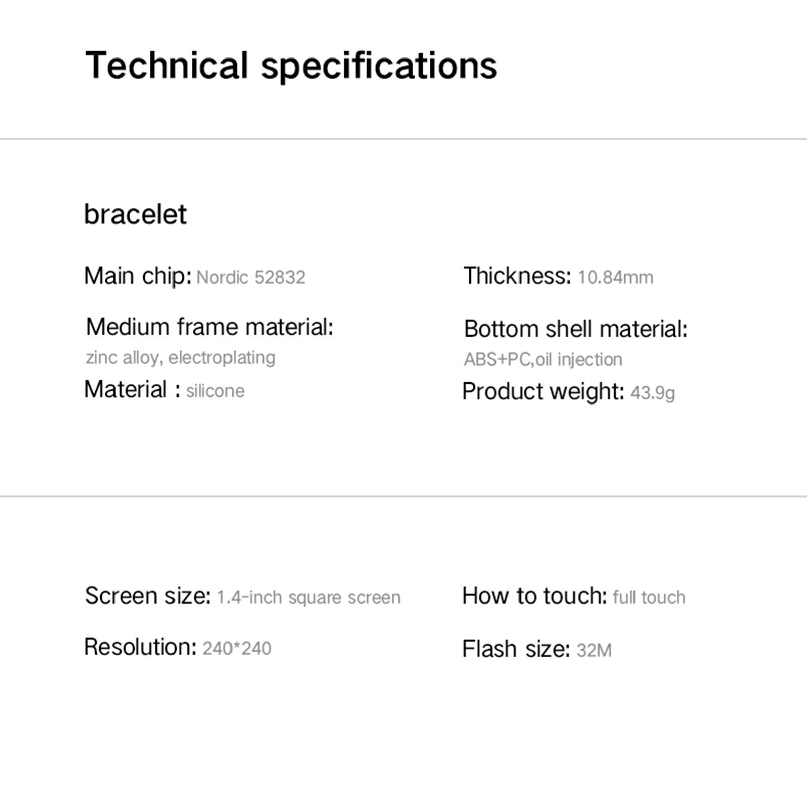 Размер экрана: 1,4in Тип экрана: TFT Нижняя оболочка Материал: АБС-пластик + Поликарбонат Материал корпуса: цинковый сплав Материал крышки: стекло Материал браслета: силикон Гель Вес одного продукта 43,9 г Основной чип: скандинавский 52832 G-сенсор: BMA421 Датчик сердечного ритма: HRS3300 T-ouch IC:716S Плоский Двигатель: Full t-ouch Разрешение: 240x280 Размер вспышки: 32 м Версия Bluetooth: BLE 4,0 Антенна: FPC Батарея: полимер Емкость аккумулятора: 180 мАч Метод зарядки: Магнитный Зарядка Время работы в режиме ожидания: 30 дней Время использования: 5-7 дней Размер изделия 42,5 мм x 36,3 мм x 9,6 мм Язык приложения: китайский, Традиционный китайский, английский, немецкий, корейский, испанский, японский, французский, Русский, Арабский, украинский, итальянский, португальскийПосылка: