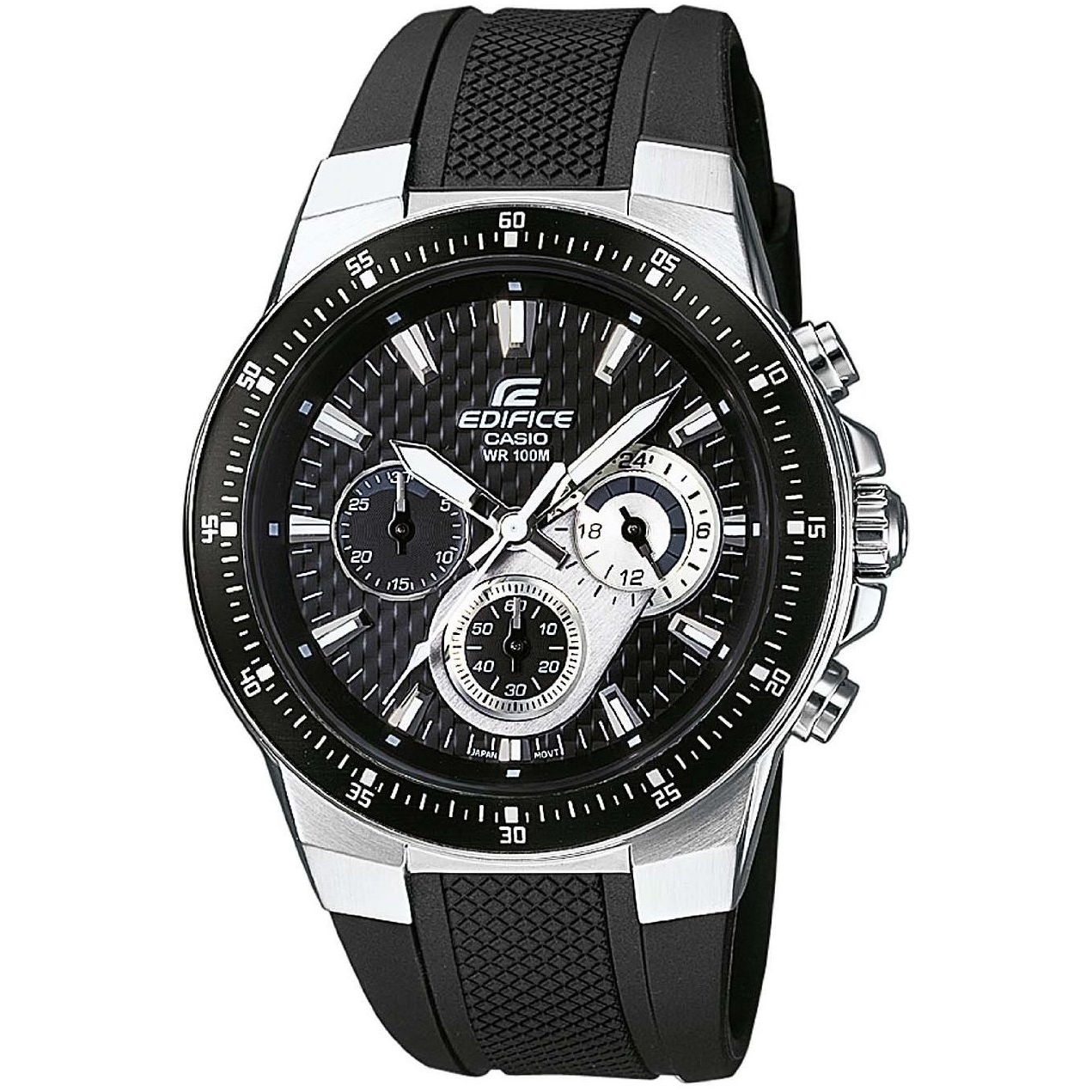 Спортивные часы из серии Edifice Chronograph для мужчин. Корпус из нерж. стали, безель с IP-покрытием, полимерный ремешок. Циферблат стилизован под карбон. Минеральное стекло. Водозащита 10АТМ. Точный кварцевый механизм с хронографом.
