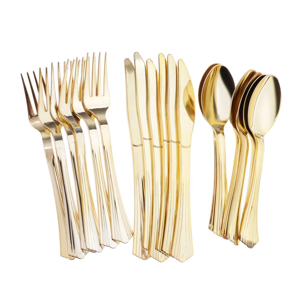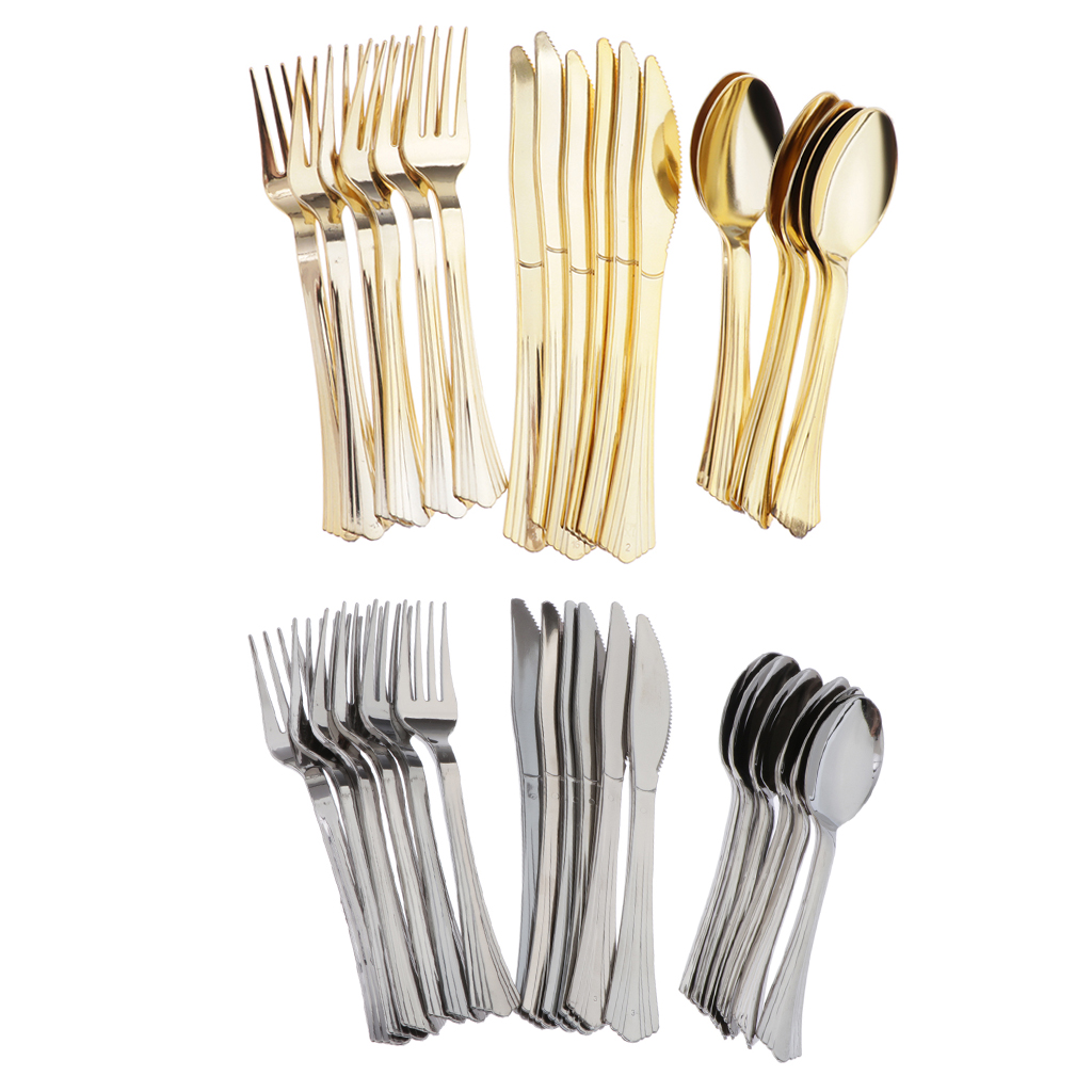18 шт Золотой/Серебряный одноразовый набор пластиковых столовых приборов 6 ножей, 6 вилок и 6 ложек.