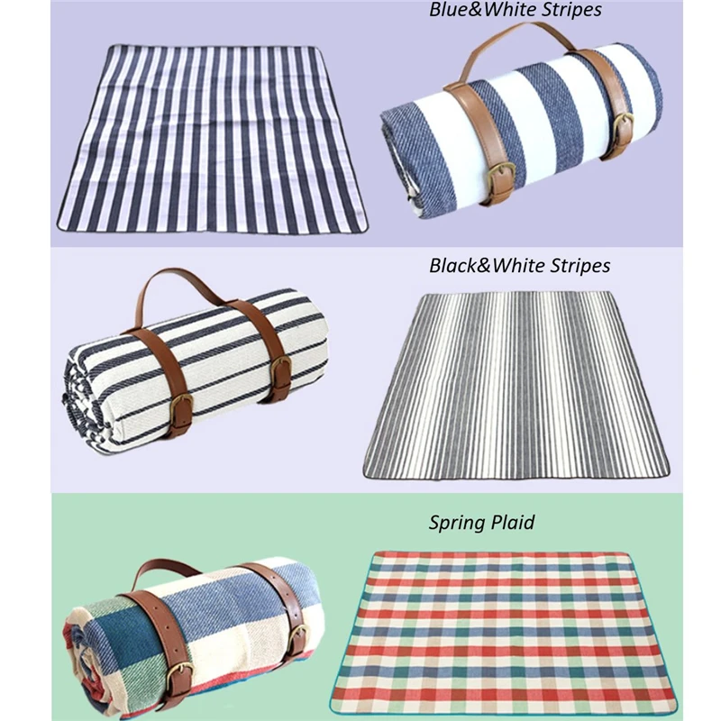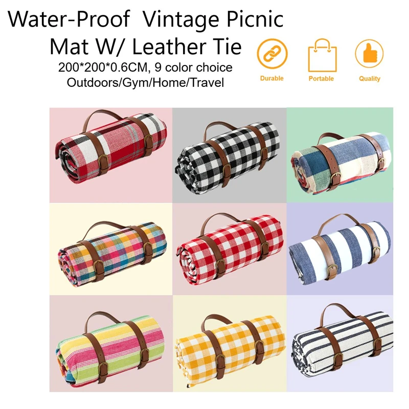 Информация о продукте: коврик для пикника с кожаной ручкой Материал поверхности: 140GSM акрил Подкладка: губка 2 мм Низ: 100% водонепроницаемый на задней части PEVA Размер: 200*200 см/150*200 см