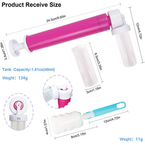 ?[Suitable Size&Lightweight]: Manual spray gun that is suitable for all kinds of pastries.The diameter of the decorating pump is about 9.6 x 1.2 inches, Net Weight is 0.3lb and the container with scal can hold 1.4 ounces (40 ml). Each spray gun has 4 storage tanks for easy replacement.