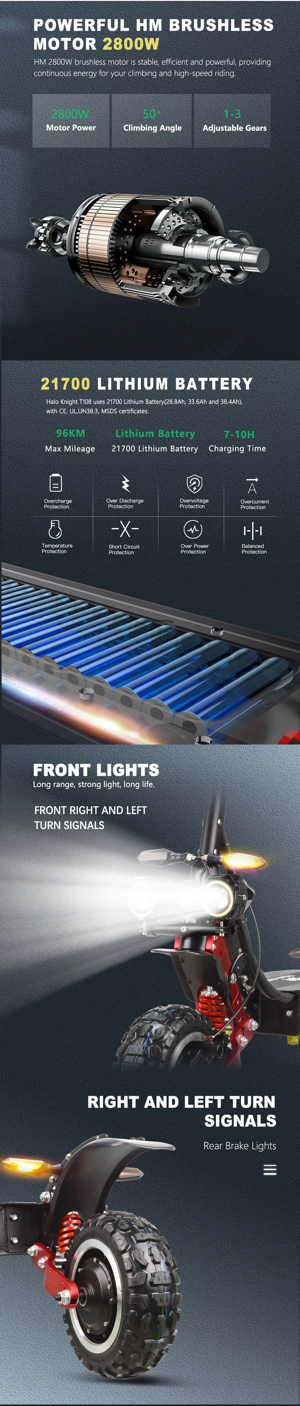 A: T108-это двойной привод 60 в, с мотором HM 60 в 2800 Вт (магнит 45 мм), контроллером JP 37A(45A), 21700 батареей 28. 8ач/33. 6ач/38,4ач, передняя и задняя амортизация, яркие Угловые глаза, рожок мотоцикла, задний тормозной светильник, передние и задние поворотники, качественный руль 62 см.