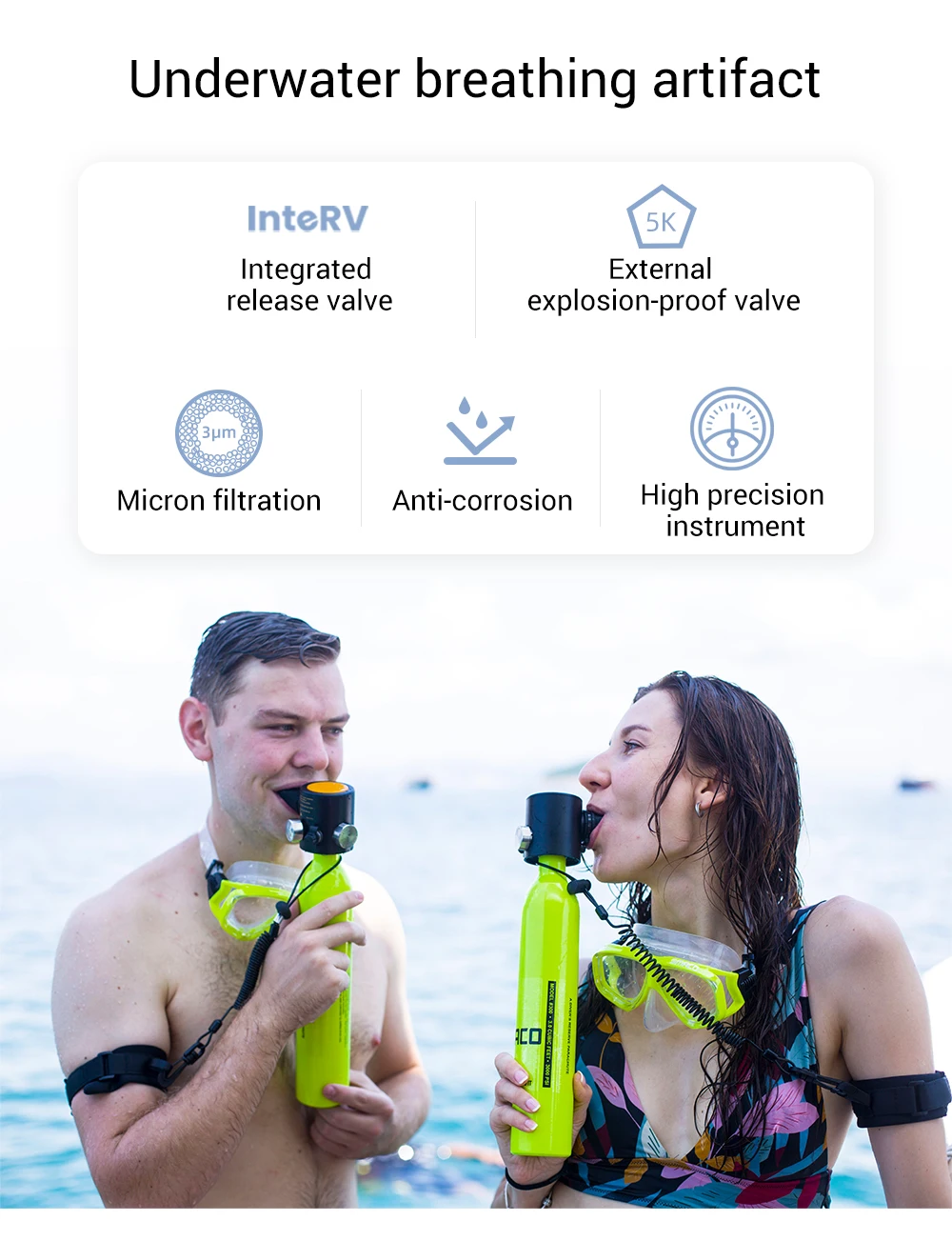 Емкость для дайвинга составляет 0,5л, а используется для 170 подводных Дыханий с полной емкостью. Время погружения используется для 5-10 минут. Вес продукта составляет 2,38 фунтов, что позволяет легко использовать его под водой.