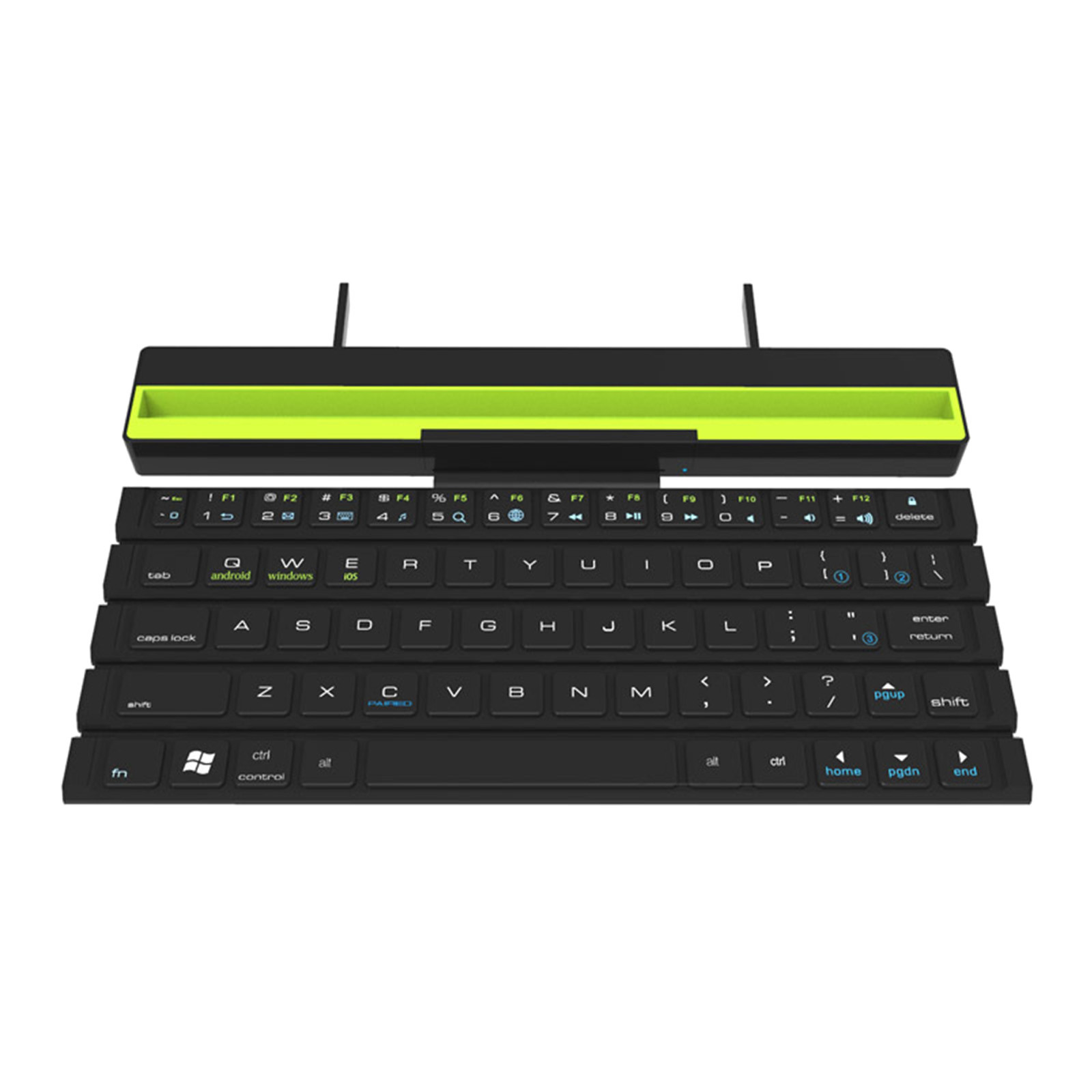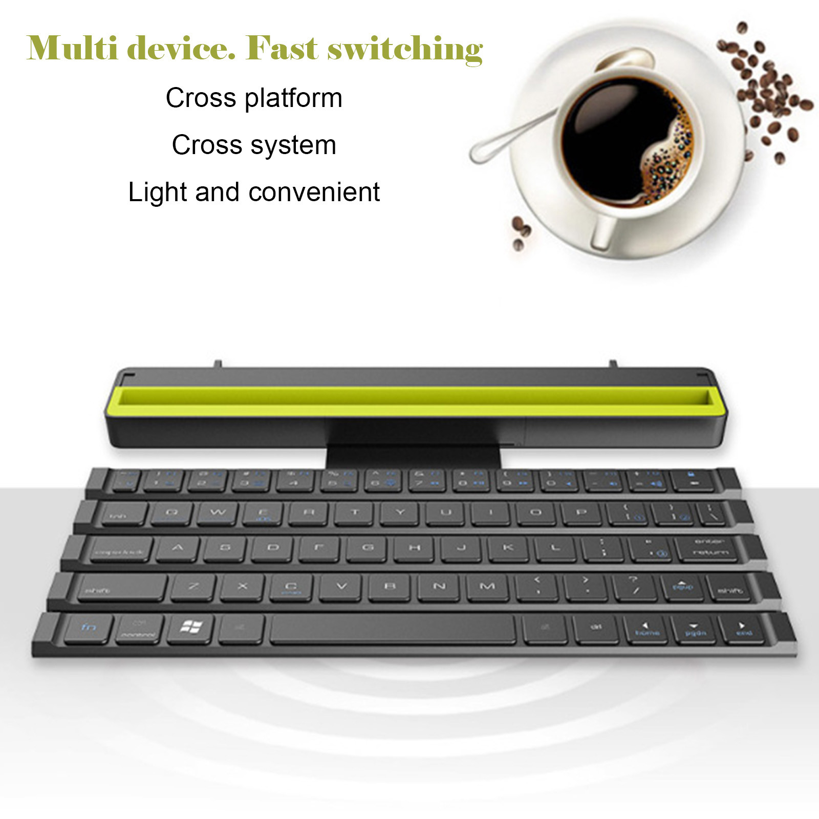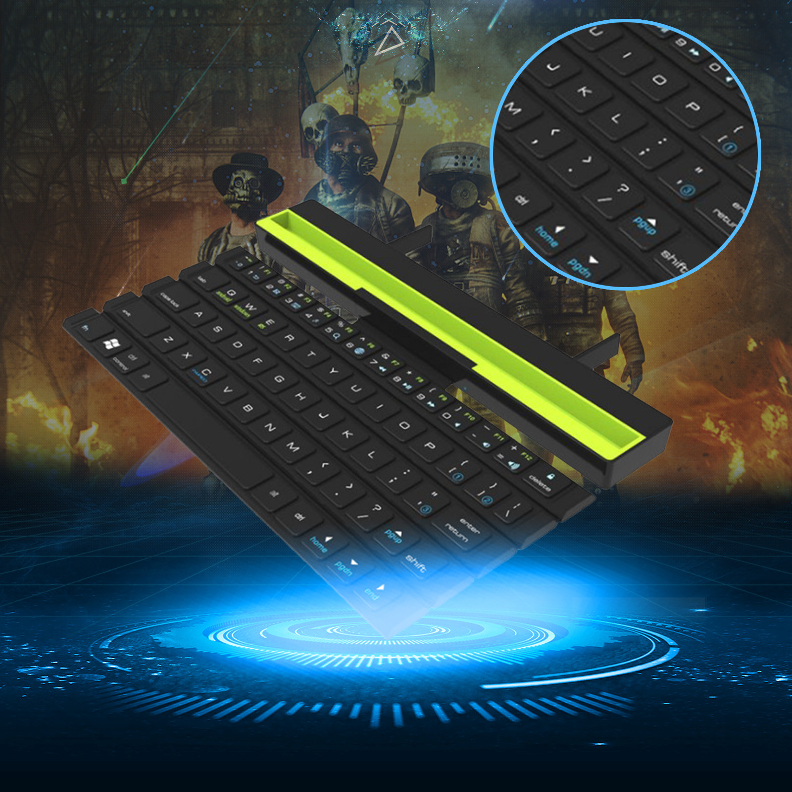 1. With holder for Table PC iPad iPod iPhone and smartphones, ect. 2. 64 keys compatible with IOS, Android, Windows systems. 3. Multi-device: pair up to 3 devices. 4. Auto On/Off- unroll/roll up keyboard. 5. 64 standard buttons, covering common functions and multimedia functions, standard key spacing, faster typing and more comfortable feel. 6. Keyboard surface spray rubber oil, Is not easy dirt, wear, anti-hand lines. 7. Folding small compact, can be put into the pocket after folding can dust.Specifications: