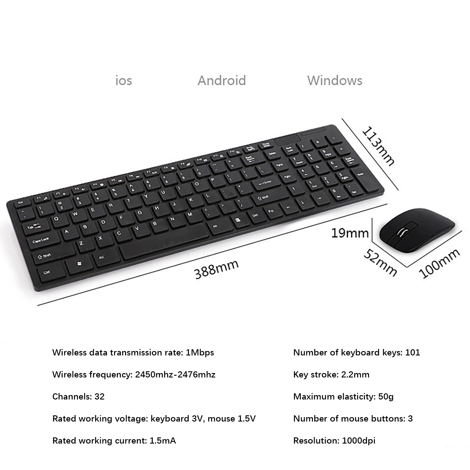 1. Комбинация беспроводной клавиатуры и мыши, Расширенный 2,4 ГГц plug-and-play Конфигурация, используйте только небольшой приемник для беспроводного подключения клавиатуры и Мышь к компьютеру. Беспроводная технология 2,4 ГГц обеспечивает прочность Подключение и надежный беспроводной радиус действия 10 м. 2. Мышь имеет скорость курсора 1000 DPI, имеет высокую скорость отклика и Чувствительные оптические линзы могут свободно работать на большинстве поверхностей рабочего стола Компьютер. 3. Полный размер, максимальный комфорт и производительность, мышь обеспечивает поддержку Рука. 4. Мягкая кожа, защита от пота, прочные нескользящие мягкие резиновые ролики Свободно скользят, используйте вперед/назад. 5. Этот продукт используется с батареями, он не оснащен батареями, когда Отправка, пожалуйста, готовьтесь заранее.Параметры продукта: