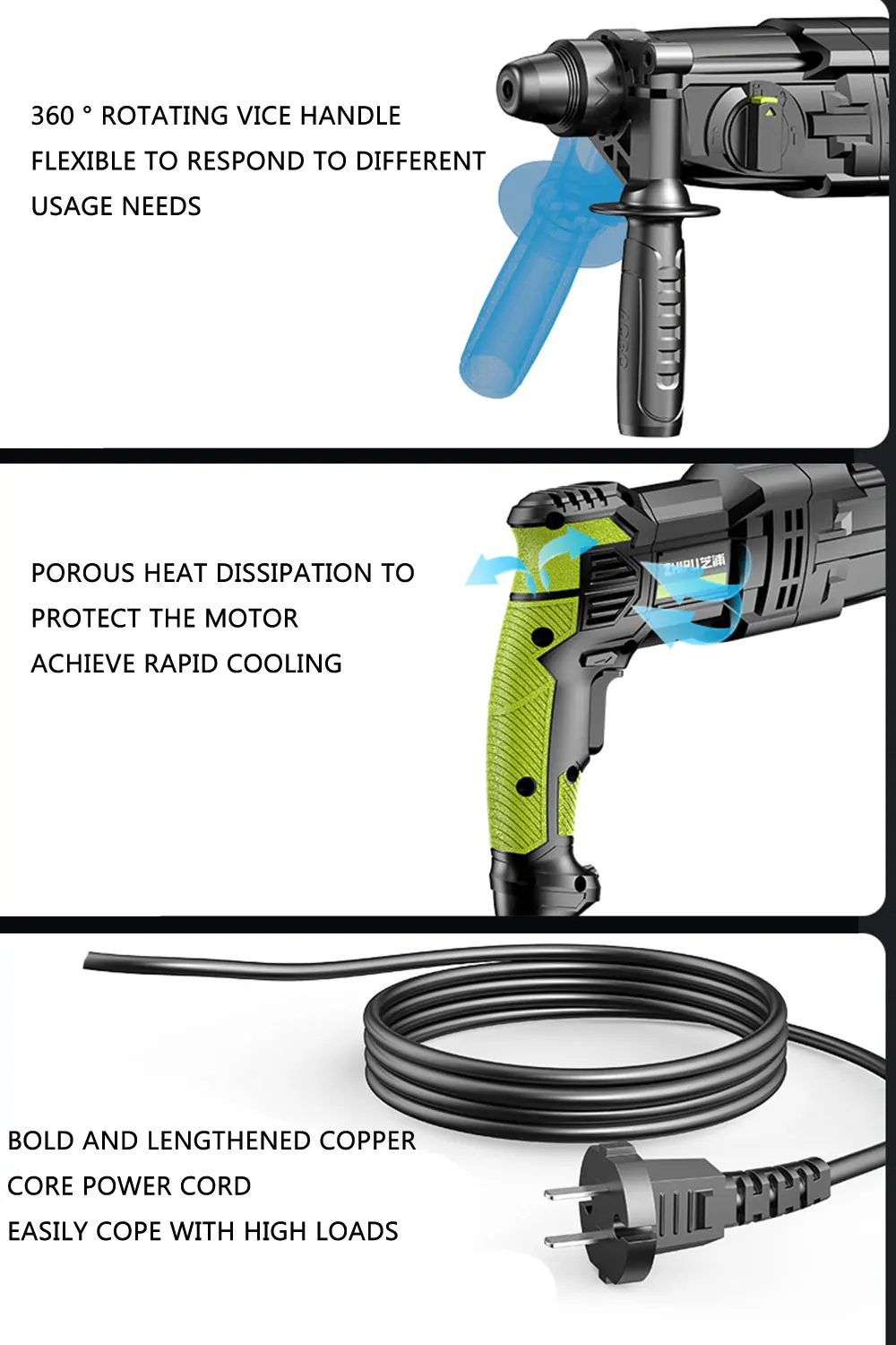 Эргономичный дизайн может уменьшить вибрацию, генерируемую сверлом, и уменьшить шум. Эффективно уменьшает усталость. Корпус изготовлен из алюминиевого сплава и магниевого сплава, со встроенной вентиляционной системой для предотвращения перегрева. Новый дизайн патрона лаборатории уменьшает воздействие и увеличивает энергию удара более чем на 20%.