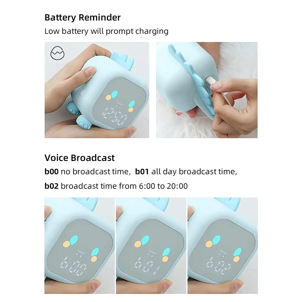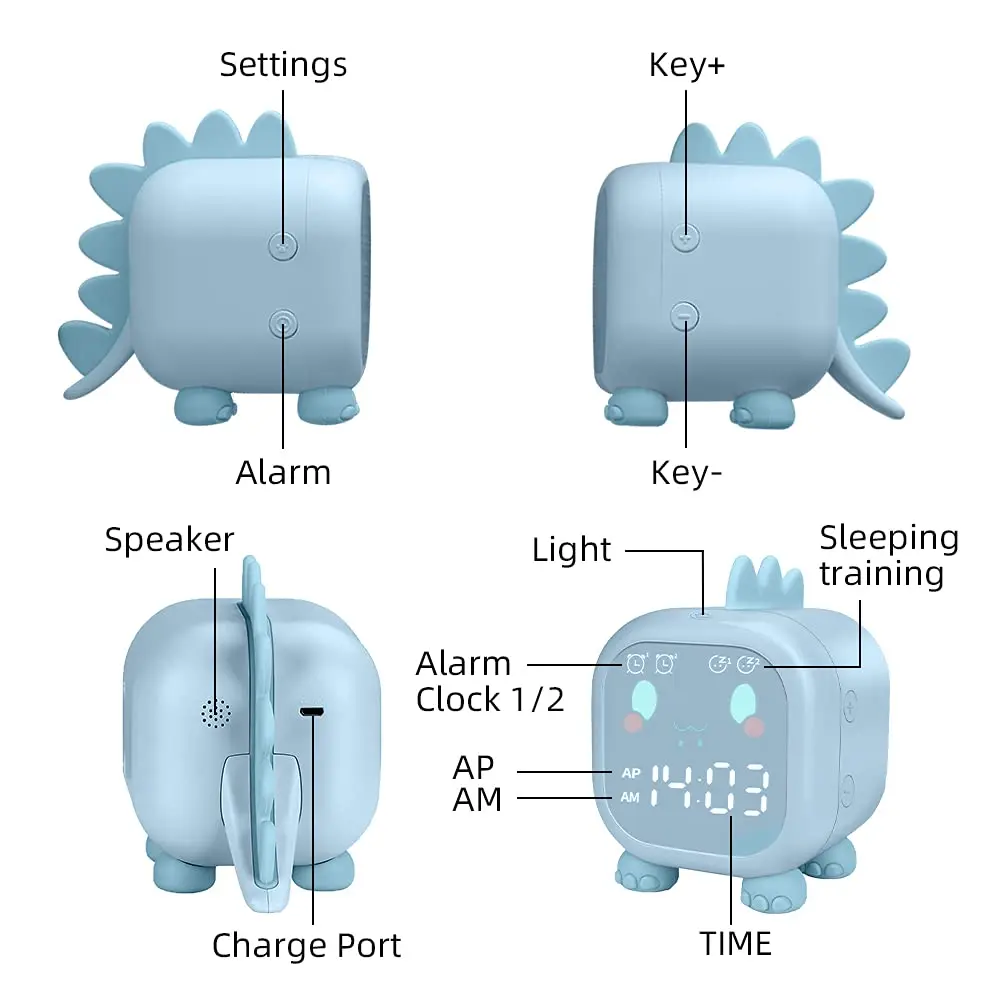 Этот милый детский будильник в виде динозавра изготовлен из безопасного АБС-пластика и силикона. Часы для тренировки сна одобрены Fcc, Ce, Rohs. Это первый выбор для детских подарков на день рождения и праздник, очень подходит для спален, детских ночников, отдыха, кемпинга на открытом воздухе.