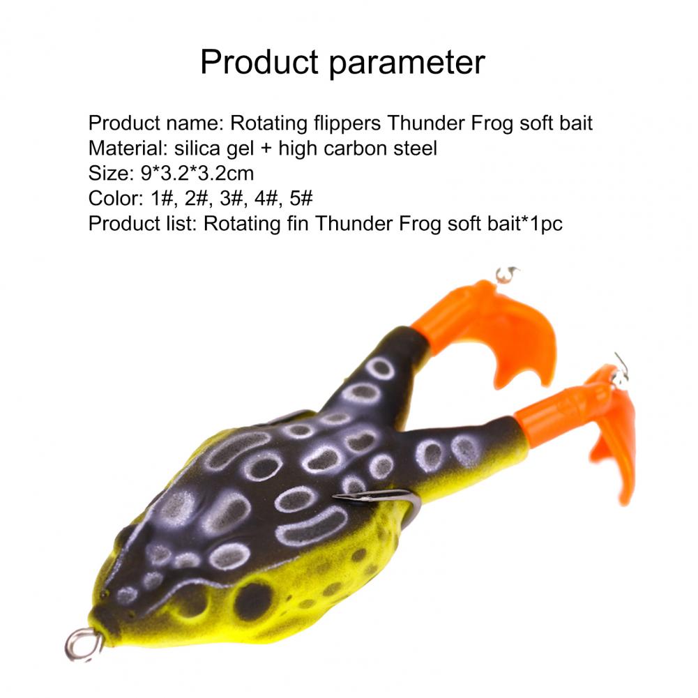 С двумя пропеллерами и вращающимися плавниками на 360 °, продукт может увеличить эффект водного изготовления и привлечь хищников для атаки. Продукт принимает отдельный дизайн Тандер лягушки приманки тела и ребра, который имеет сильную гибкость и хороший эффект в реальной боевой среде.