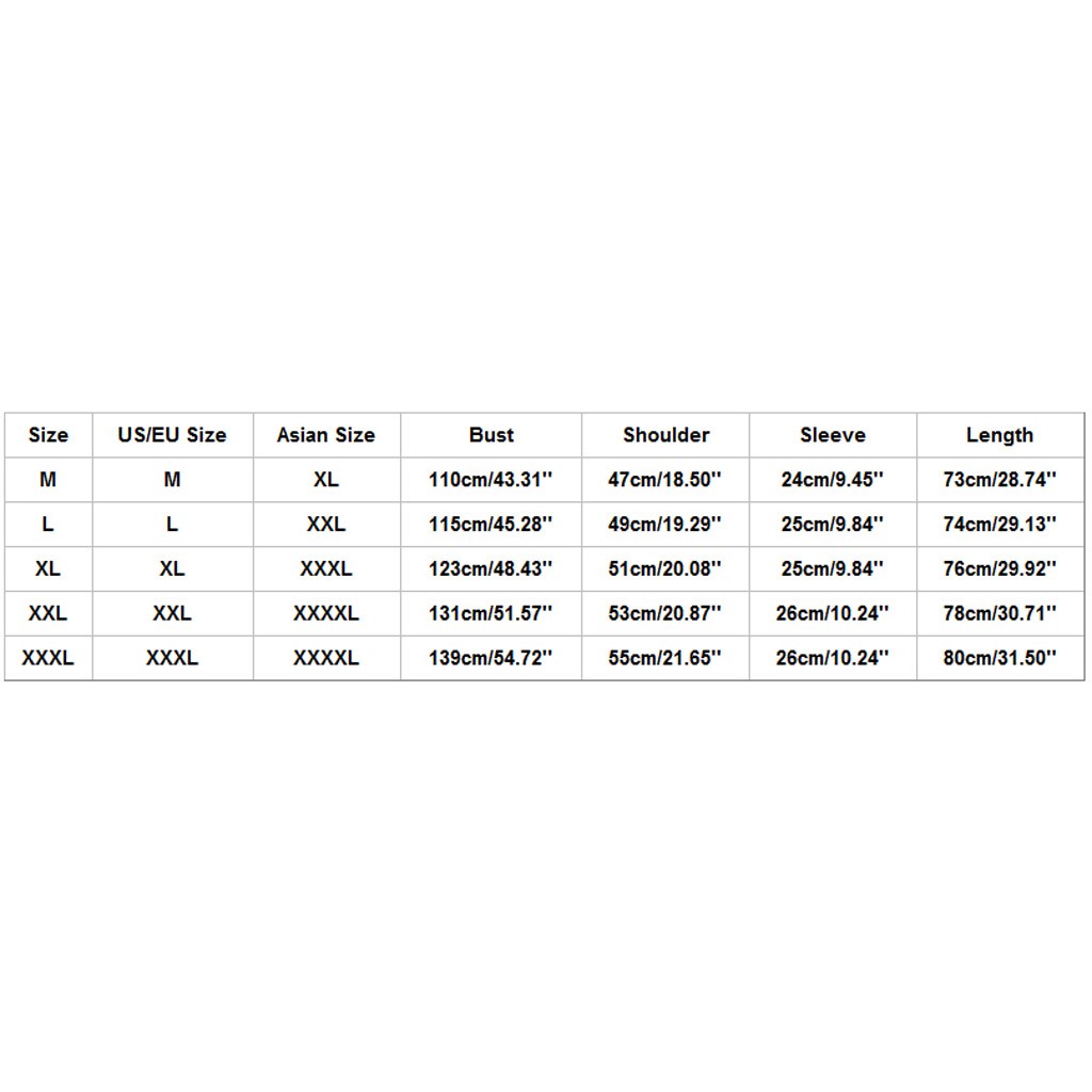Размеры Размер США/ЕС Азиатский размер Бюст Плечо Рукав Длина М М XL 110 см/43,31'' 47 см/18,50'' 24 см/9,45'' 73 см/28,74'' L L XXL 115 см/45,28'' 49 см/19,29'' 25 см/9,84'' 74 см/29,13'' XL XL XХХL 123 см/48,43'' 51 см/20,08'' 25 см/9,84'' 76 см/29,92'' XXL XXL XXXXL 131 см/51,57'' 53 см/20,87'' 26 см/10,24'' 78 см/30,71'' XХХL XХХL XXXXL 139 см/54,72'' 55 см/21,65'' 26 см/10,24'' 80 см/31,50''