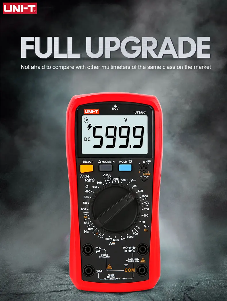 Цифровые мультиметры UT890 серии 6000-count true RMS разработаны с большим ЖК-дисплеем. Максимальная измеряемая емкость составляет 100 МФ, с быстрым временем отклика менее 12 с. Измерения NCV и непрерывности имеют акоусто-оптические показания. UT890D + имеет функцию LIVE для различия между живыми и нейтральными проводами. Кроме того, он оснащен автоматическим детектором взрывов и защитой от высокого напряжения.