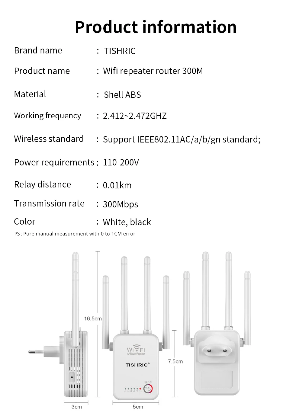 Название бренда: TSHRIC Название продукта: Wifi ретранслятор маршрутизатор 300 м Материал: корпус ABS Рабочая частота: 2,412-2,472 ГГц Стандарт беспроводной связи: Поддержка стандарта IEEE802.11AC/a/b/gn Требования к питанию: 110-200 в Скорость передачи: 300mbpc Цвет: белый, черный