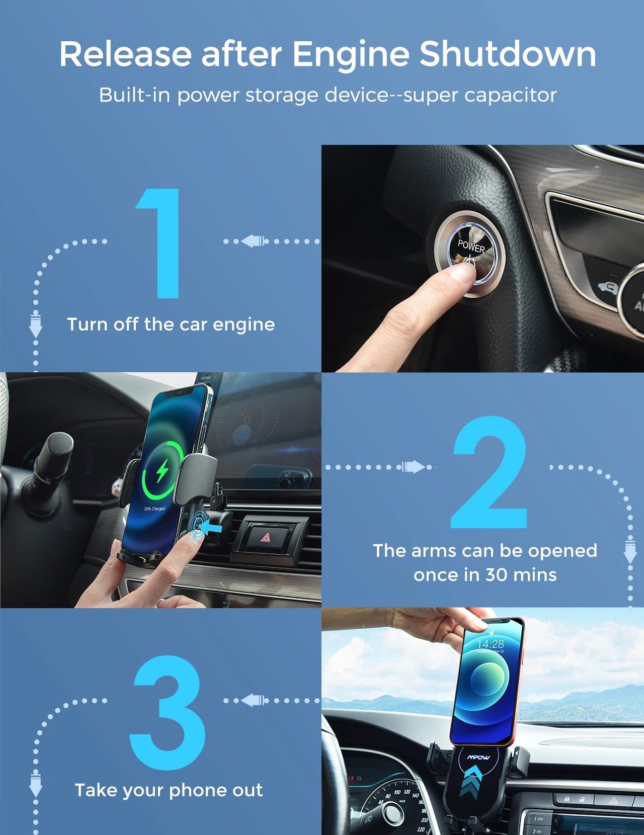 Руки автоматически открываются, когда беспроводное автомобильное зарядное устройство подключено к питанию, а также автоматически закрываются, как только телефон будет помещен в люльку. Крепление имеет встроенную настройку хранения питания. Когда двигатель вашего автомобиля выключен, вы можете открыть руки один раз, чтобы вынуть телефон в течение 30 минут.