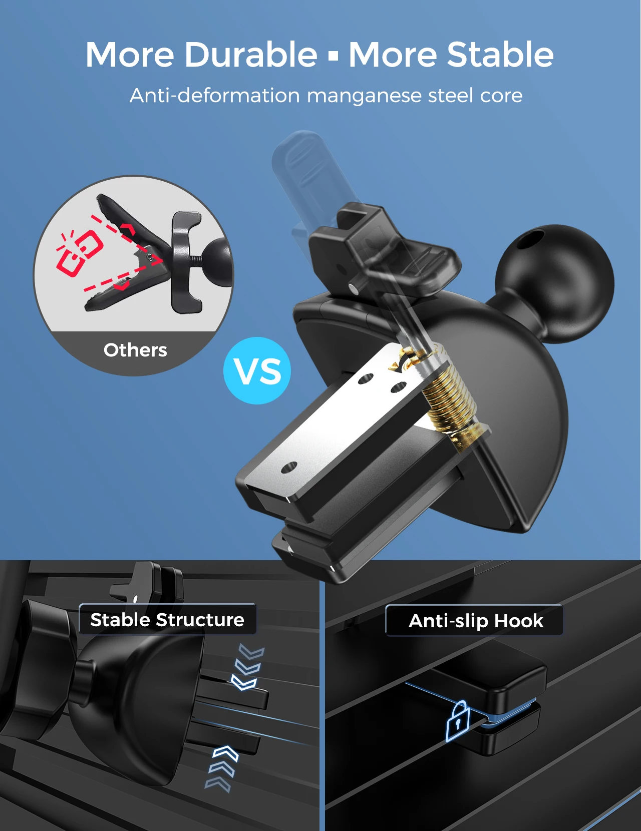 В устанавливаемое на вентиляционное отверстие в салоне автомобиля Автомобильное Крепление к вашим услугам 3 уровня регулировки скорости зажим, который может хорошо работать с большинством вентиляционные отверстия (горизонтальном и вертикальном положении, устанавливаемое на вентиляционное отверстие в салоне автомобиля лезвия). Кроме того, его стабильный зажим и роботизированные боковины могут надежно удерживать ваше устройство на месте, не боясь падения, даже на шатких дорогах.
