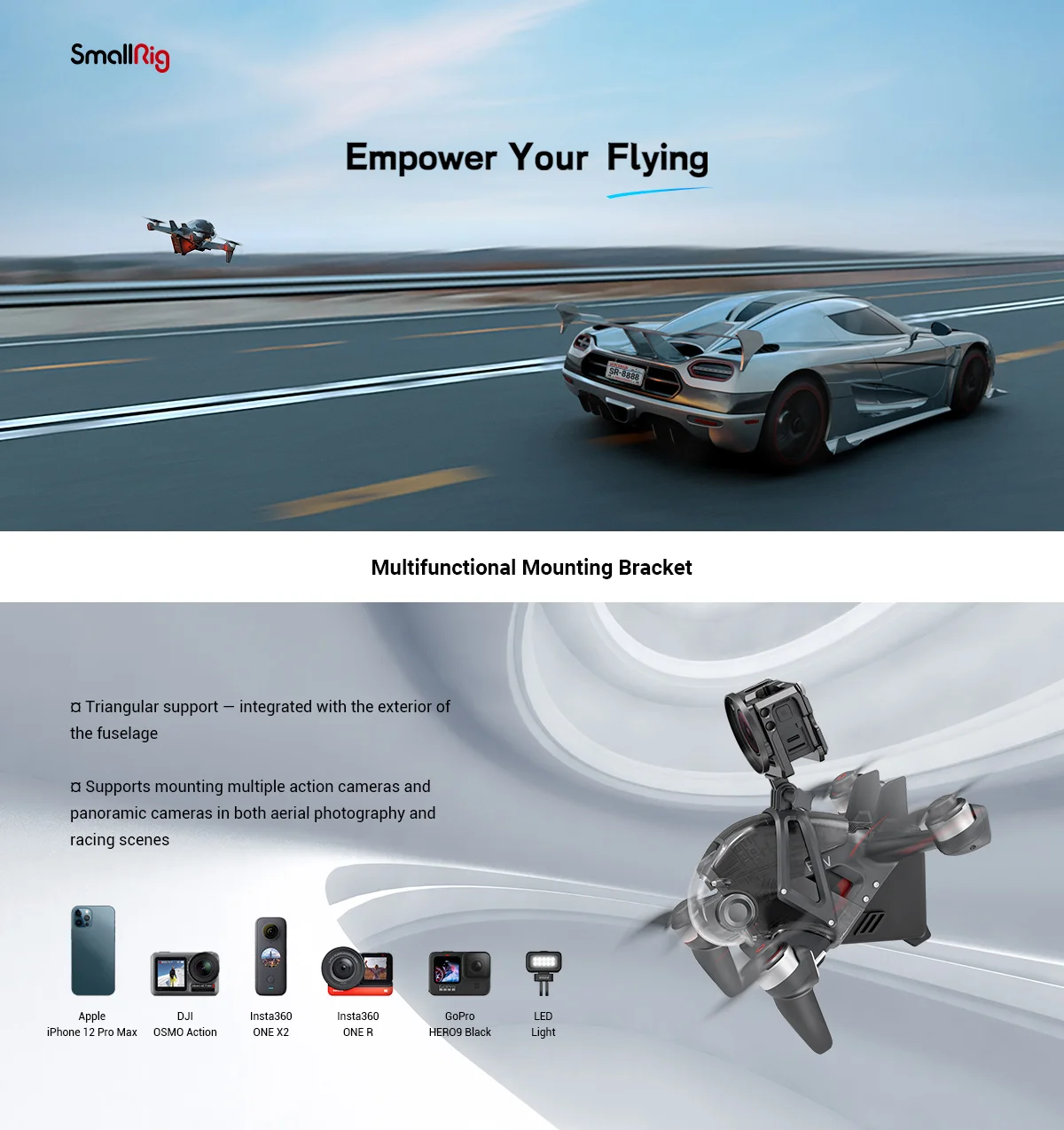 3. Адаптированы к нескольким экшн-камерам и панорамным камерам как в аэрофотосъемке, так и в гоночных сценах.
