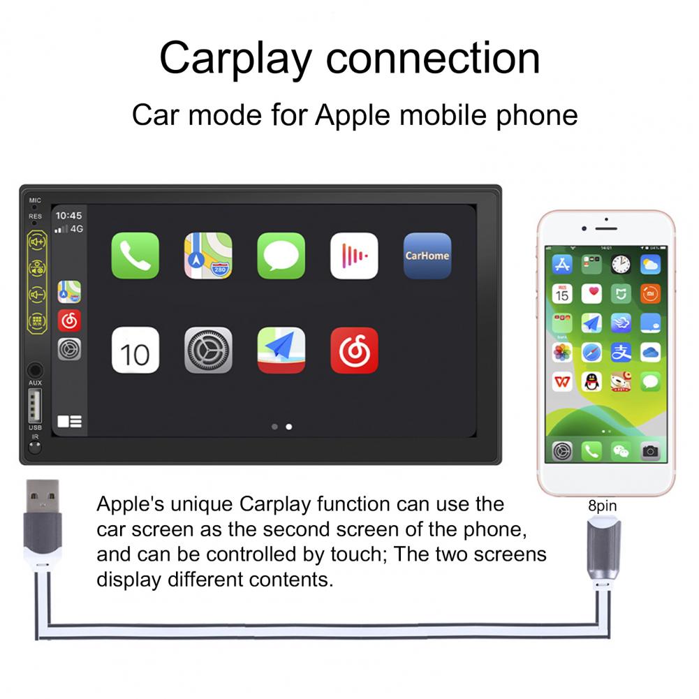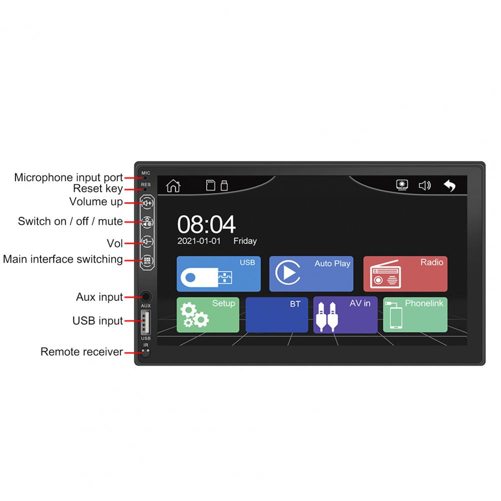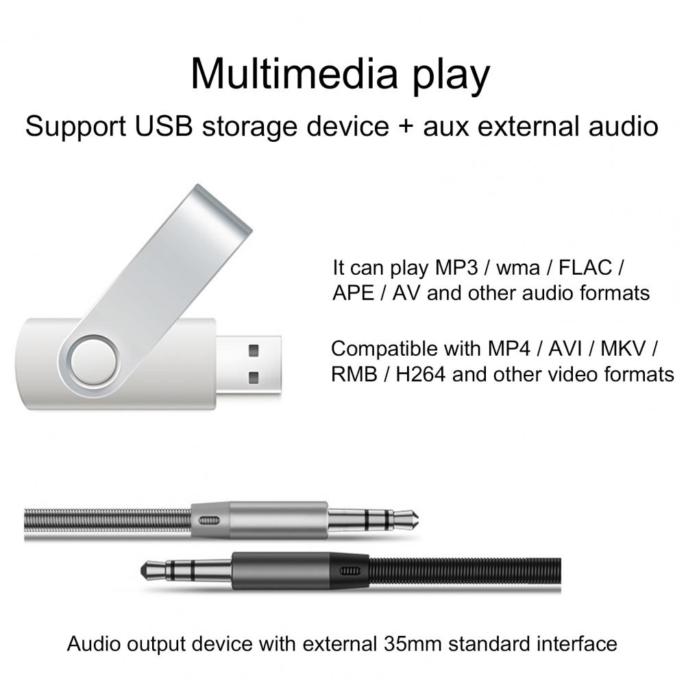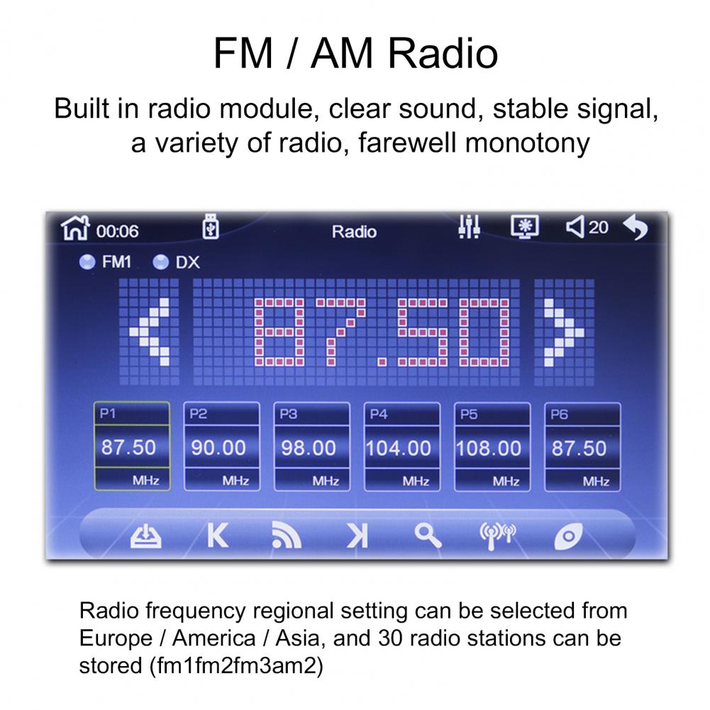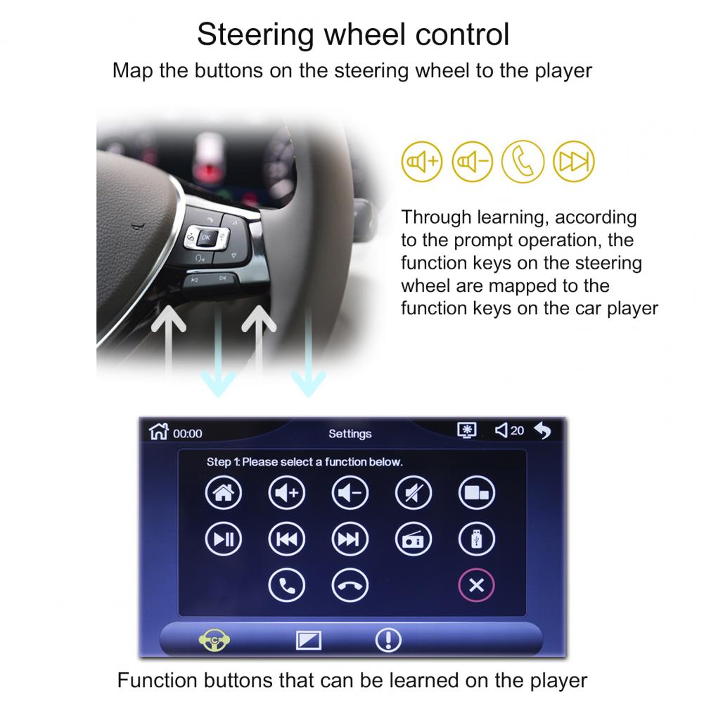 Многофункциональный продукт поддерживает функцию радио, чтение u-диска/карты (аудио/видео/картинка), функцию AUX, функцию Bluetooth, аудиовыход RCA (который может быть связан с сабвуфером), функция заднего вида (нужно купить камеру самостоятельно), видео вход, оригинальная функция обучения рулевого колеса автомобиля, зеркальная ссылка (для Android/Apple), И функция воспроизведения автомобиля (для Android/для Apple).