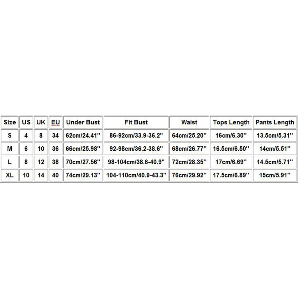 Размеры США Великобритания ЕС Под грудью Облегающий бюст Талия Длина топа Длина брюк S 4 8 34 62 см/24,41 дюйма 86-92 см/33,9-36,2" 64 см/25,20 дюйма 16 см/6,30 дюйма 13,5 см/5,31 дюйма М 6 10 36 66 см/25,98 дюйма 92-98 см/36,2-38,6" 68 см/26,77 дюйма 16,5 см/6,50 дюйма 14 см/5,51 дюйма L 8 12 38 70 см/27,56 дюйма 98-104 см/38,6-40,9" 72 см/28,35 дюйма 17 см/6,69 дюйма 14,5 см/5,71 дюйма XL 10 14 40 74 см/29,13 дюйма 104-110 см/40,9-43,3" 76 см/29,92 дюйма 17,5 см/6,89 дюйма 15 см/5,91 дюйма