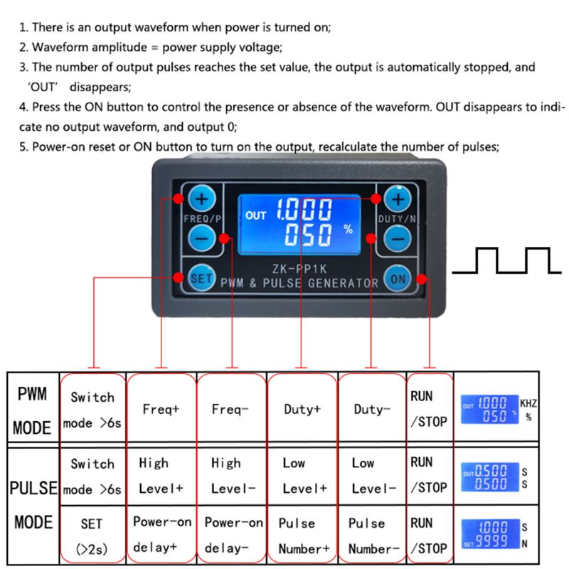 Заводским режимом по умолчанию является режим PWM, FREQ + и FREQ-key set, DUTY + и DUTY-button set duty cycle; Короткое нажатие на кнопку управления выходом сигнала или остановкой, стоп-выход 0, экран отображает отметку «OUT», так как есть выход, в противном случае он останавливает выход; Заводская частота по умолчанию составляет 1 кГц, а рабочий цикл-50%.