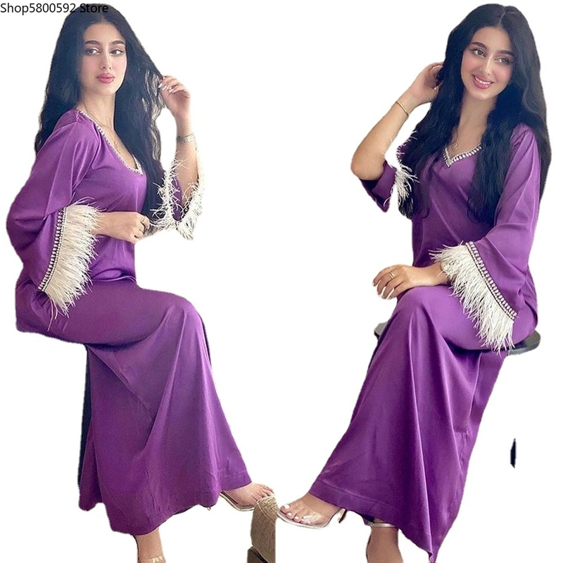 Dubai Abaya Djellaba Moroccan Kaftan Women Diamond Braid Trim Long Sleeve Muslim Hijab Maxi Dress Robe Arabic Islamic Clothes