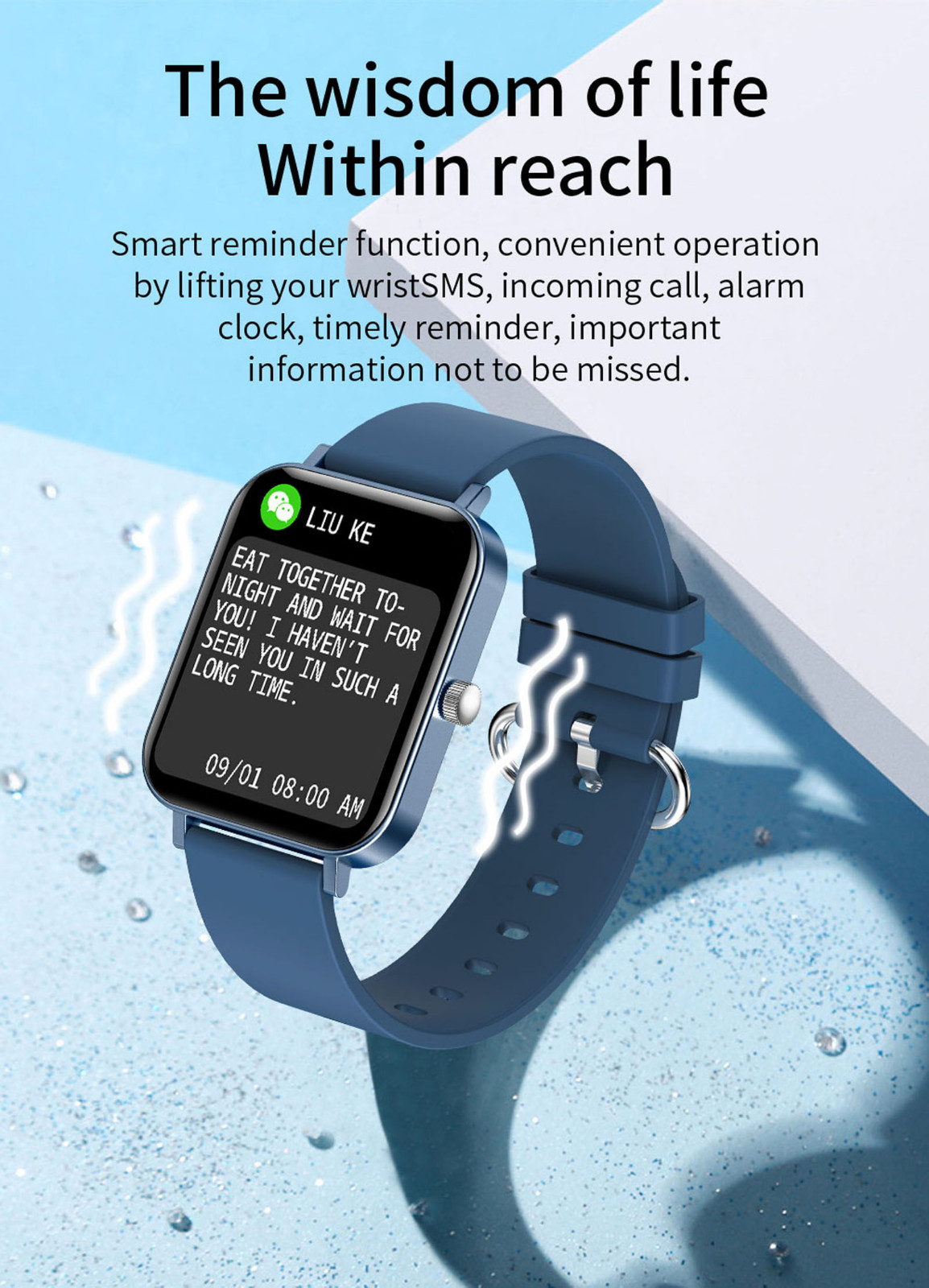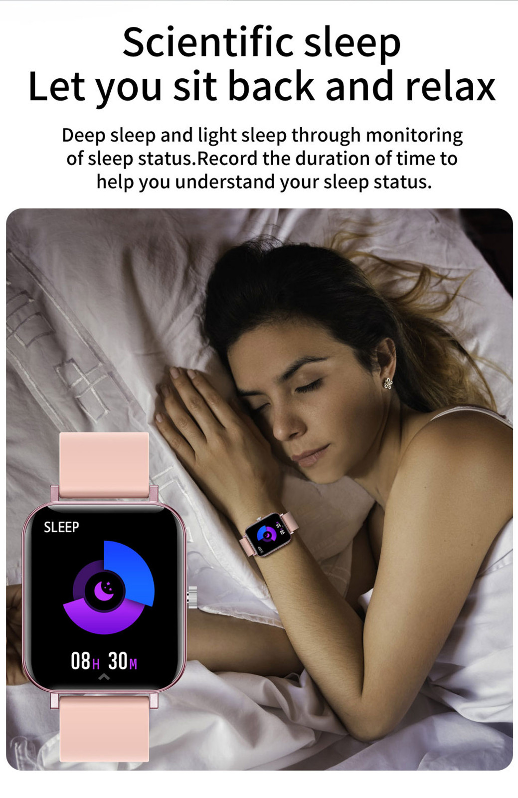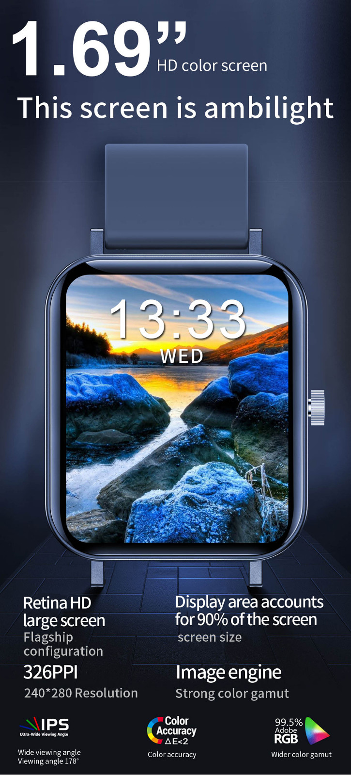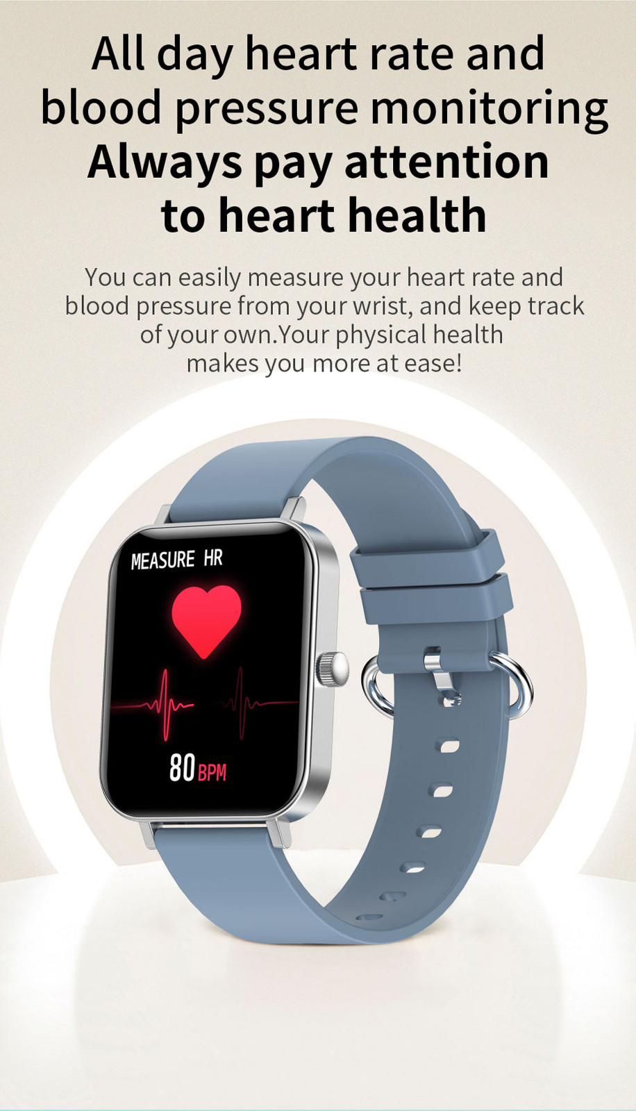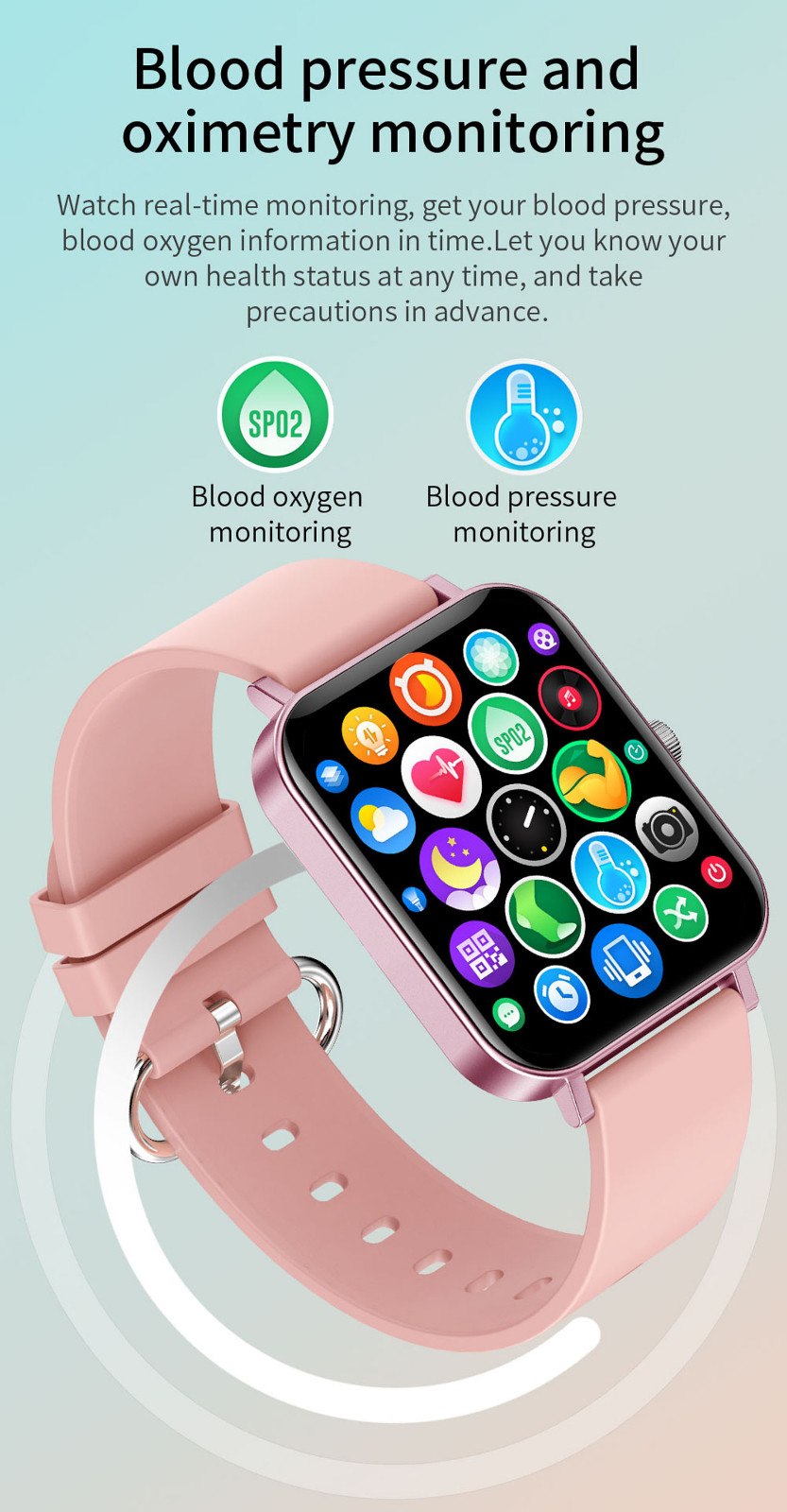 1.69inch Full touch, Spin button,call reminder push, SMS reminder push, WeChat reminder push, news reminder push, exercise record (step counting, mileage, etc.), sleep monitoring, sedentary reminder, calorie calculation, stopwatch, raise hand to brighten the screen, dynamic heart rate, blood pressure , Vibration, exercise mode, remote camera, music control, smart alarm, weather forecast, high-definition large screen, multi-dial switching, WeChat exercise, female menstrual cycle.Sports: