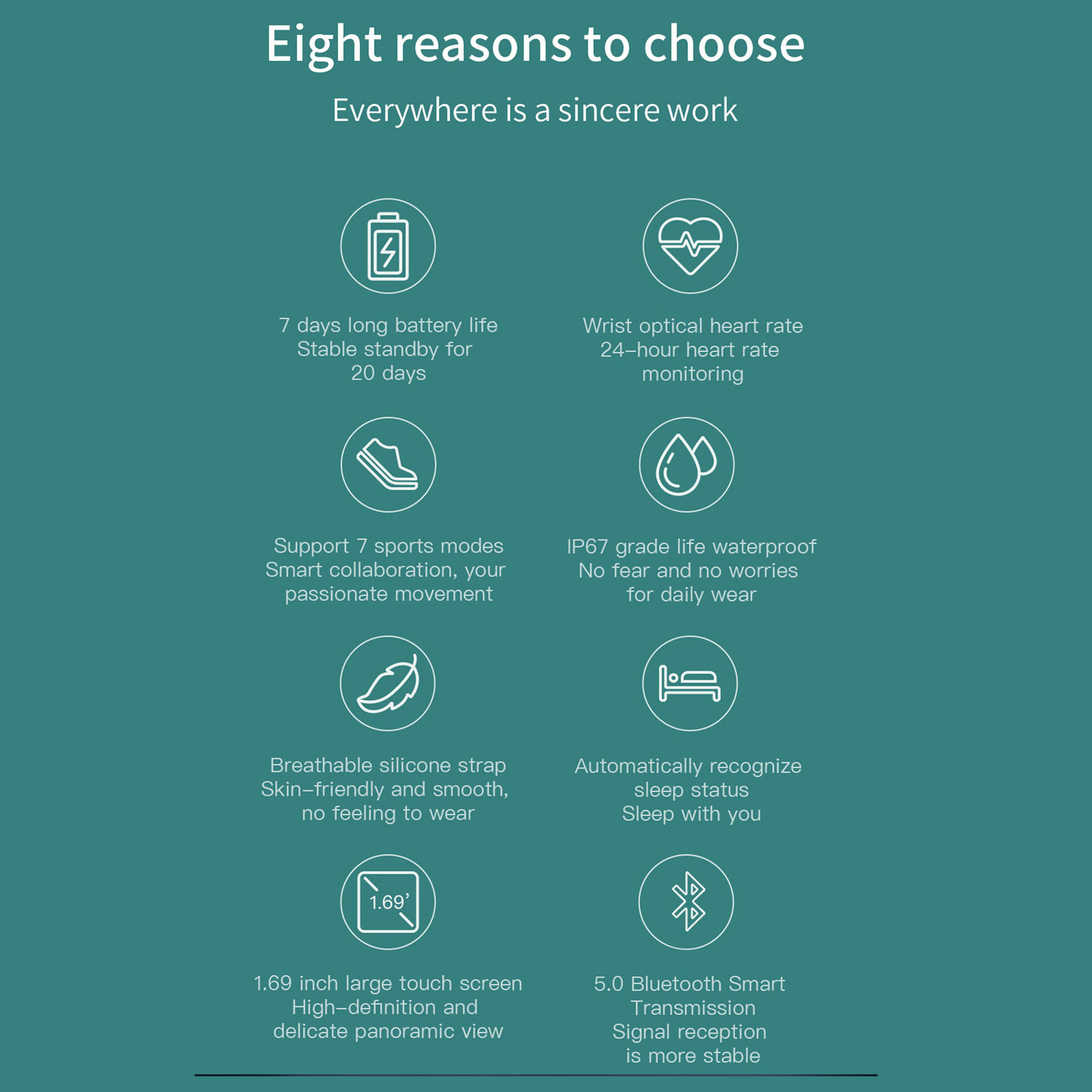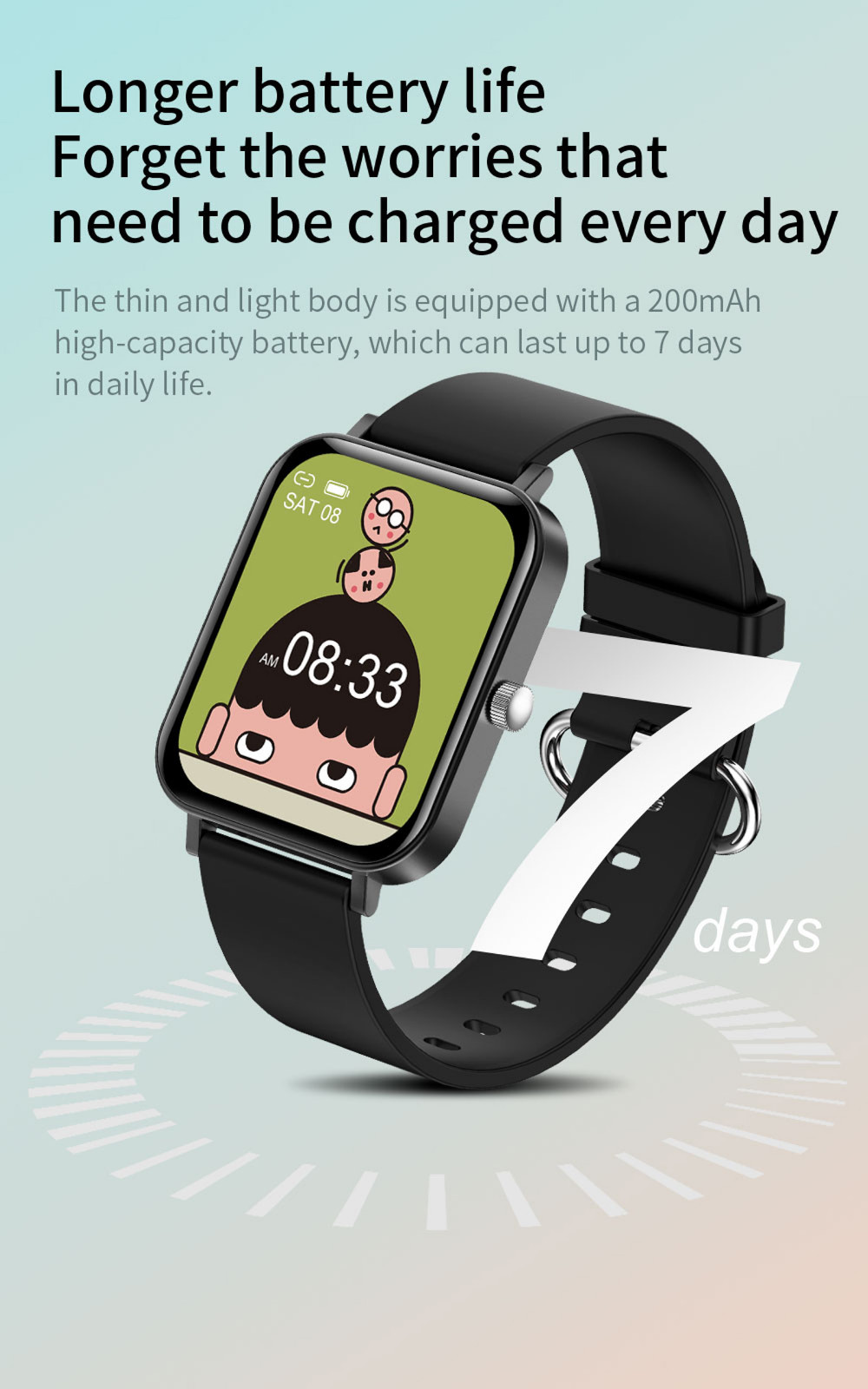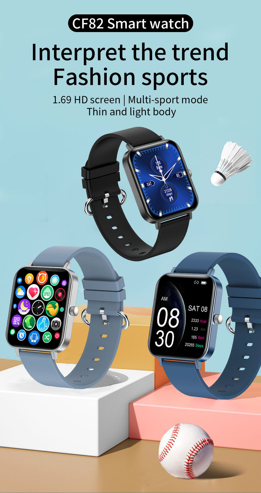 CF82 is our latest generation and most cost-effective smart watch. In this new version, CF82 smart watch has all-new 1.69in colour display and full capacitive touch, supporting taps and swipes, so it is easy to read and operate.5.0 Bluetooth smart transmission, signal reception is more stable.Soft silicone strap makes CF82 lightweight and comfortable wear on your wrist and is available Will not bring pressure to the wrist.