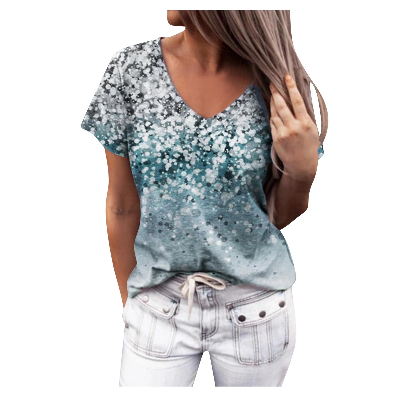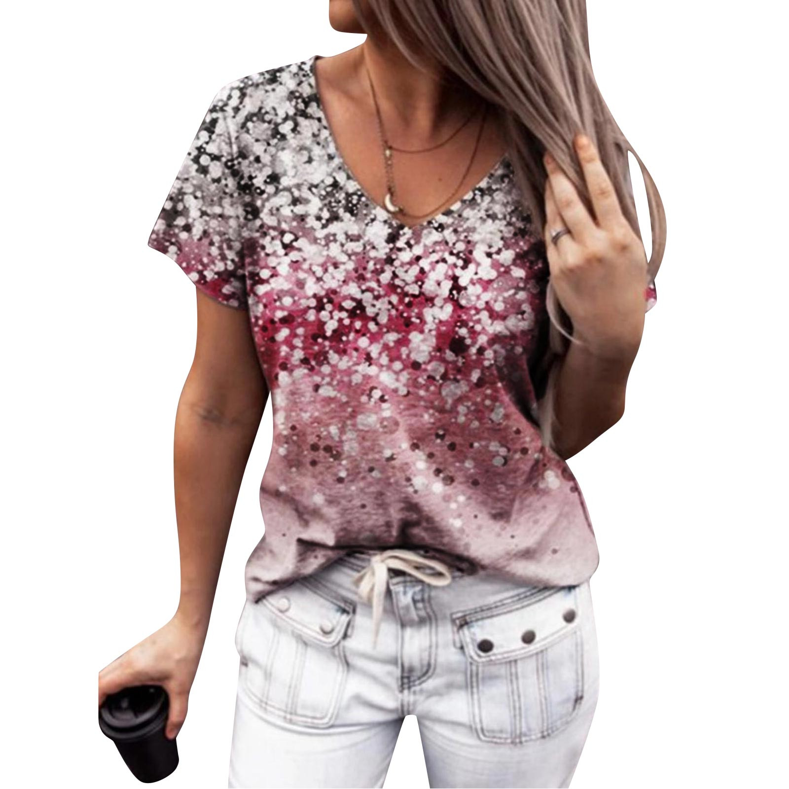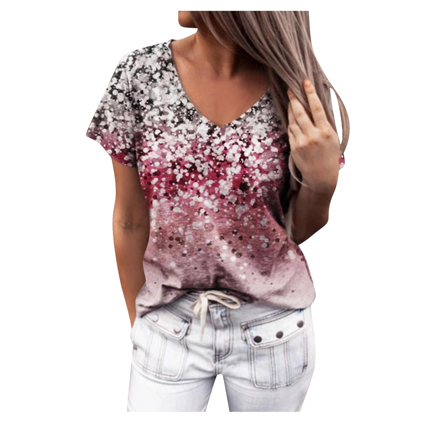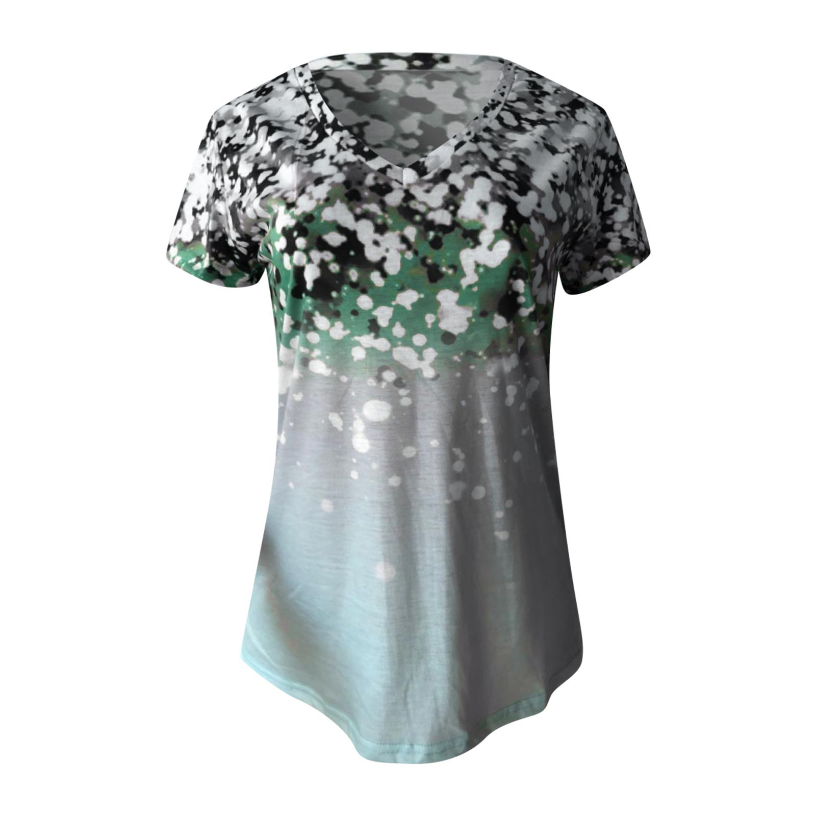 Gradient Flower Print T-Shirt Harajuku Womens V-Neck Short Sleeves Top Summer Casual Loose T-shirt Tops ropa mujer verano