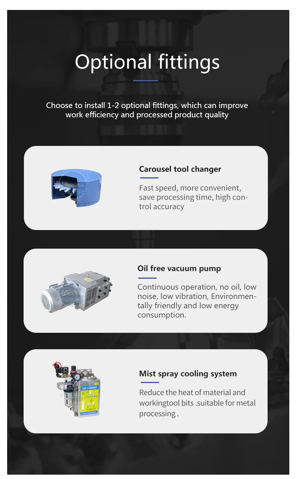 3. Высокая точность: 4 вертикальный многоцелевой станок с ЧПУ является производит стоечные и точной работы штук стабильно. После того, как управляющие будут подтверждены, 4 вертикальный многоцелевой станок с ЧПУ производит тысячи штук, в течение короткого времени.