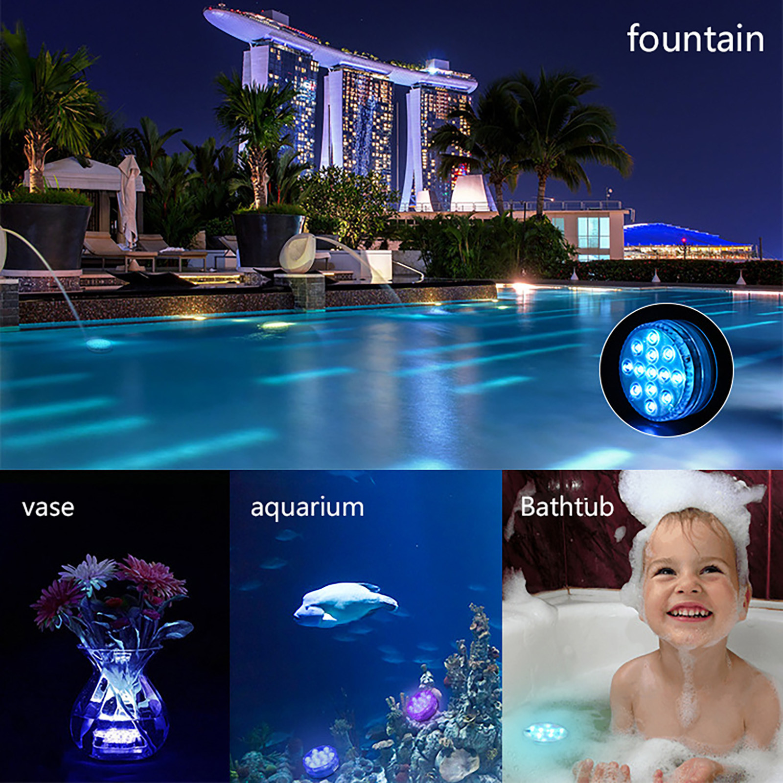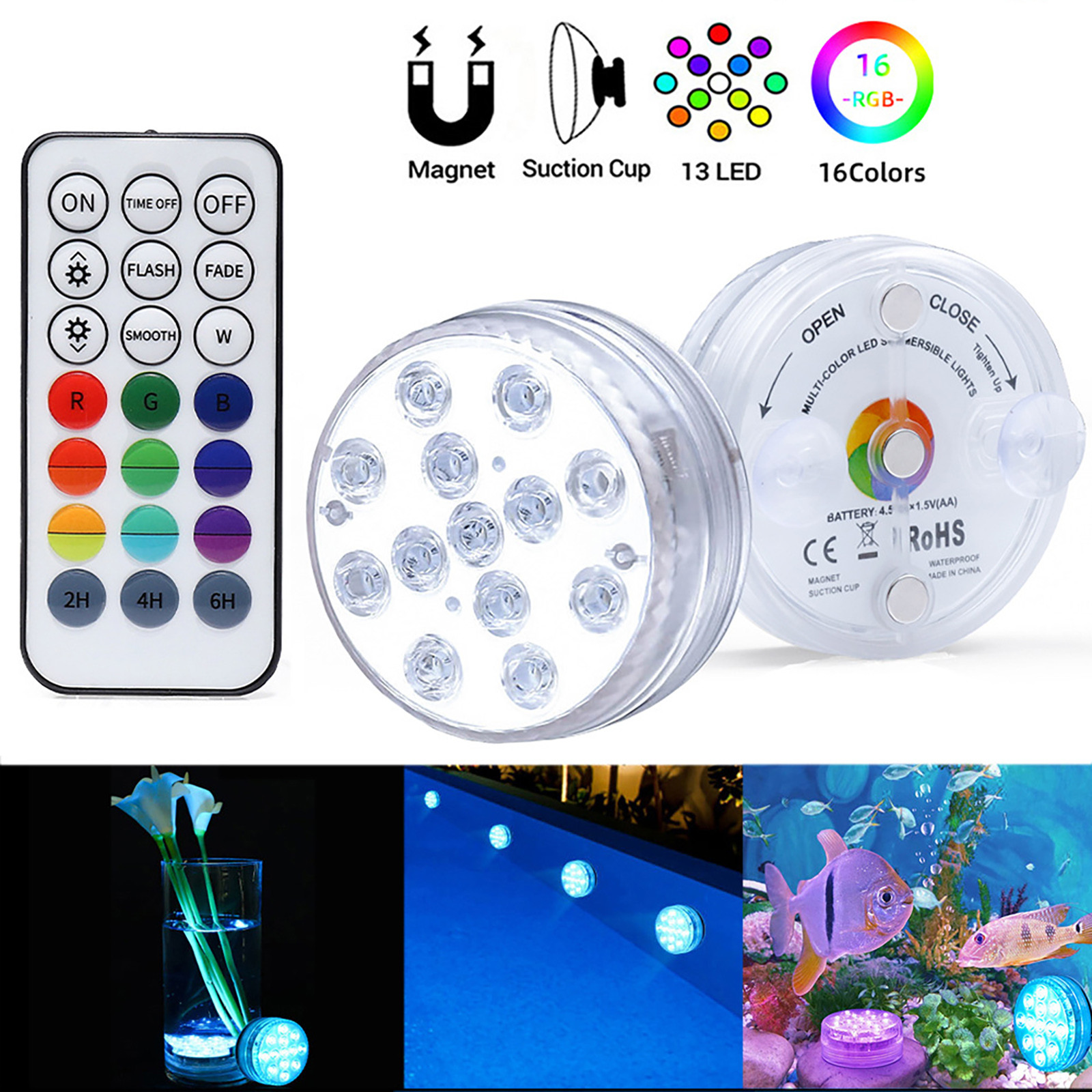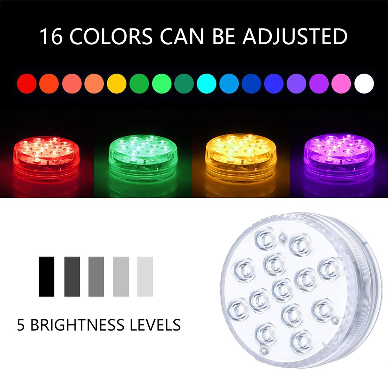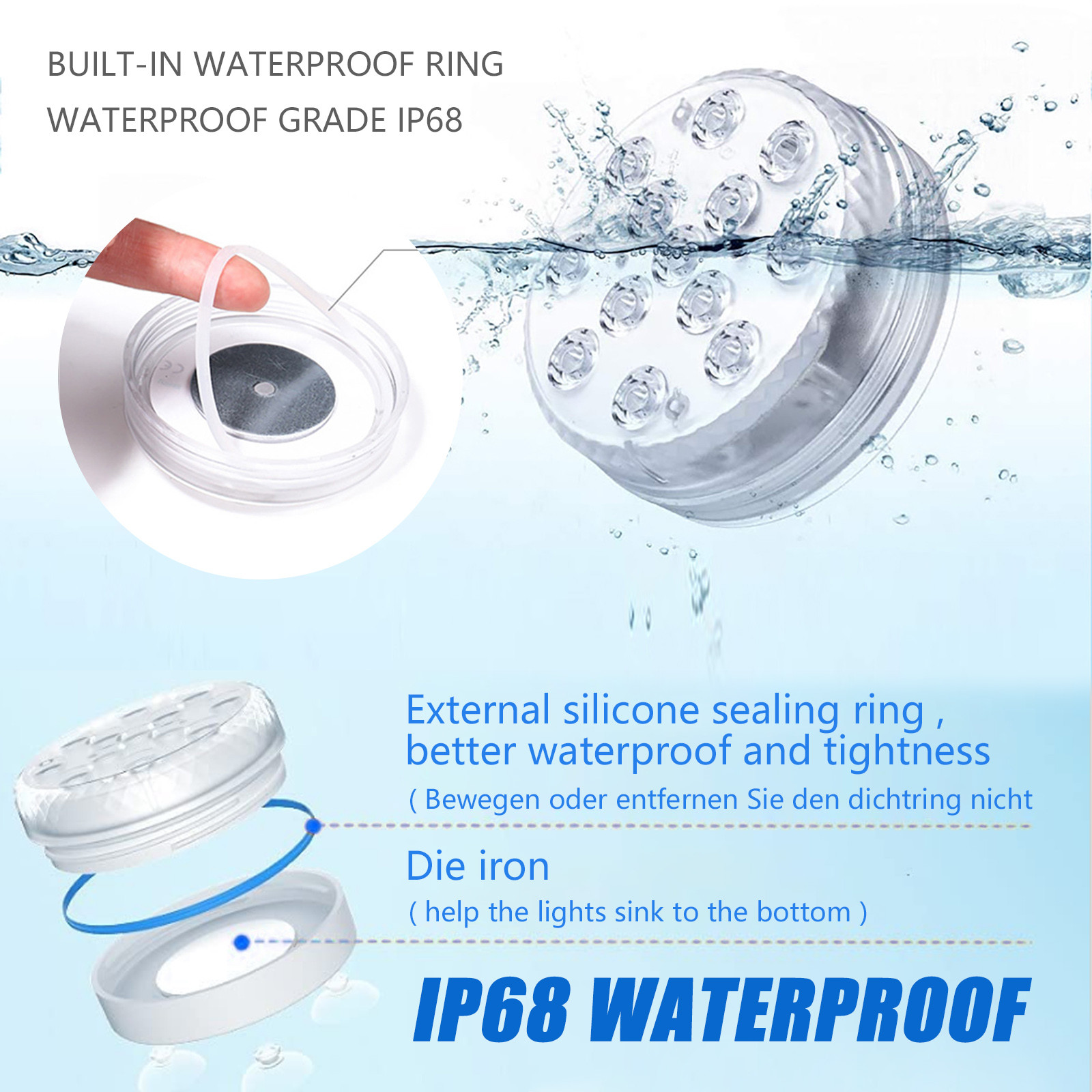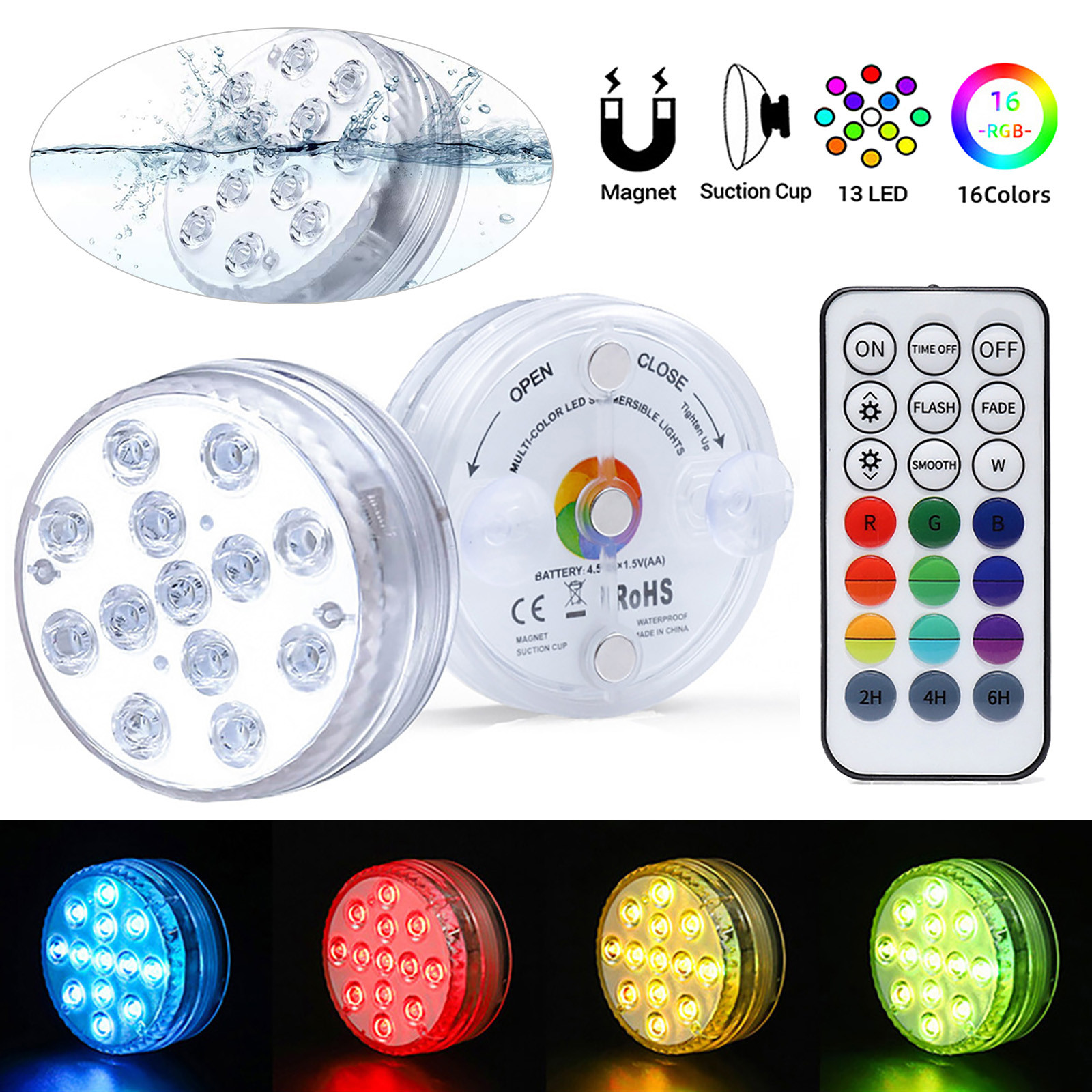 [13 светодиодов, 40 часов длинного дисплея, более яркий более прочный]: водонепроницаемый светильник для пруда s имеет 13 высококачественных светодиодных бусин, он в 3 раза ярче и ярче, чем другой погружной светильник s, который имеет только 10 светодиодов. Светодиодный светильник питается от 3 батареек AA вместо батарей AAA, он работает 20 часов, В 3 раза мощнее и дольше, чем батарея AAA (6 часов). [16 цветов, множество вариантов, затемняемый светильник для бассейна под водой]: оптимизировано 16 динамических цветов, несколько режимов (вспышка, выцветание, гладкая), увеличено 3 кнопки таймера (2h, 4h, 6h), функция затемнения, дает вам больше выбора и создает более красивую атмосферу, Он сильно отличается от других открытых бассейнов в маркетинге (6 цветов, меньше вариантов режима вспышки). С функцией памяти, он запоминает ваши последние настройки, нет необходимости устанавливать снова.Нужно принести свои собственные батареи 3xAA