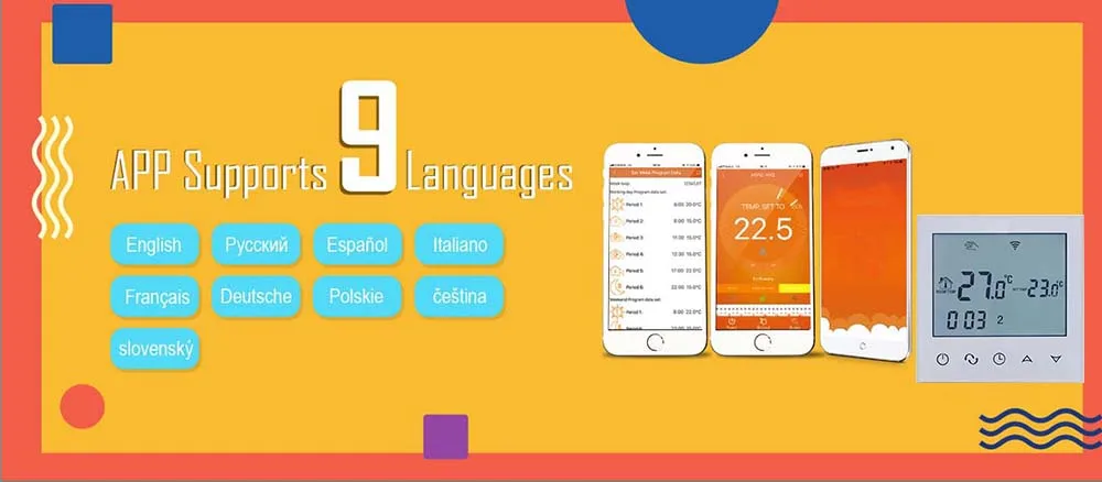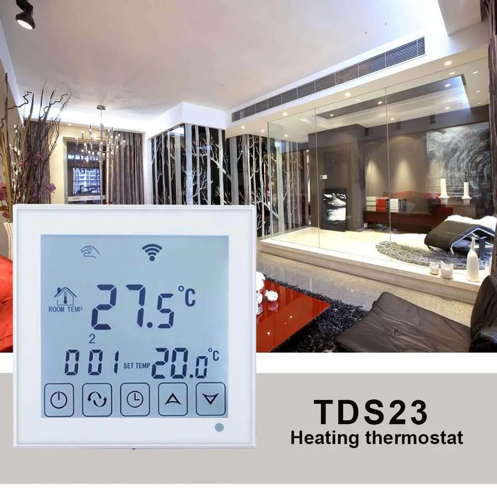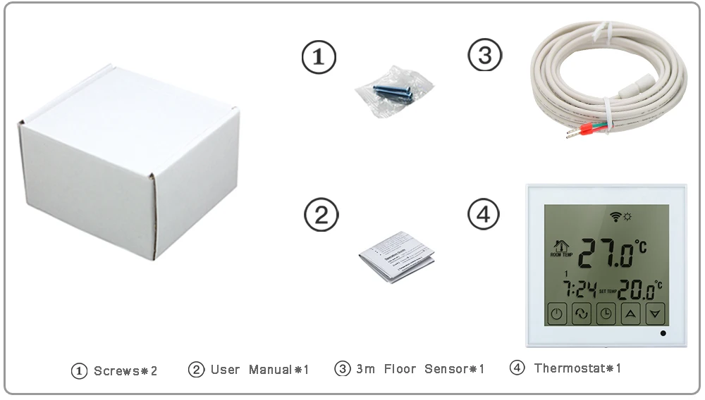Функция памяти Запомните все настройки после внезапного отключения питания. Когда питание включено снова, вам не нужно сбросить его. Программируемая функция С еженедельной программируемой функцией. 5 + 2 или 6 + 1 или 7 дней программа является необязательной. WiFi включен Позволяет легко удаленно управлять и контролировать комфорт вашего дома. Простая установка и подключение к WiFi. Легко программировать из блока или с помощью приложения. Большой травой экран с черной подсветкой, подходит для Вашего стильного дома. С 2 датчиками и 3 режимами датчика (внутренний датчик, внешний датчик, внутренний и внешний датчик). Прошел сертификацию CE и ROHS. Протестировано по самым высоким промышленным стандартам.