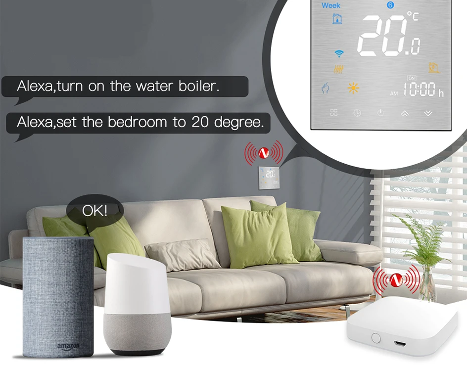 Работает с Alexa Google Home, термостат предлагает наиболее удобную температуру воды для себя, где бы вы ни находились, используя Голосовое управление под приложением Tuya Smart Life, подключенным для интеллектуального управления.