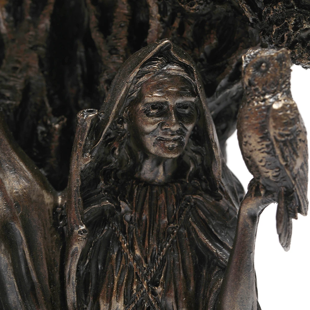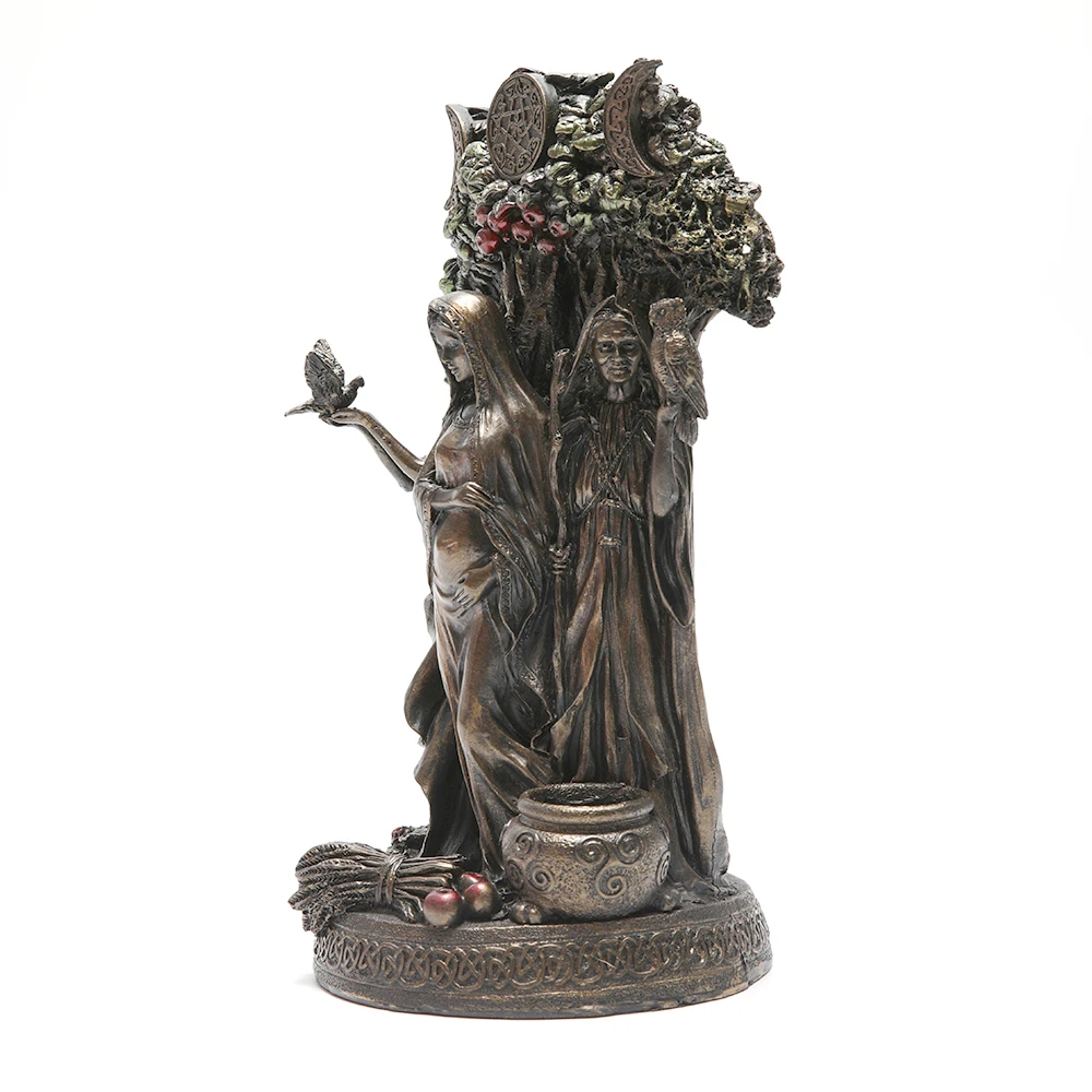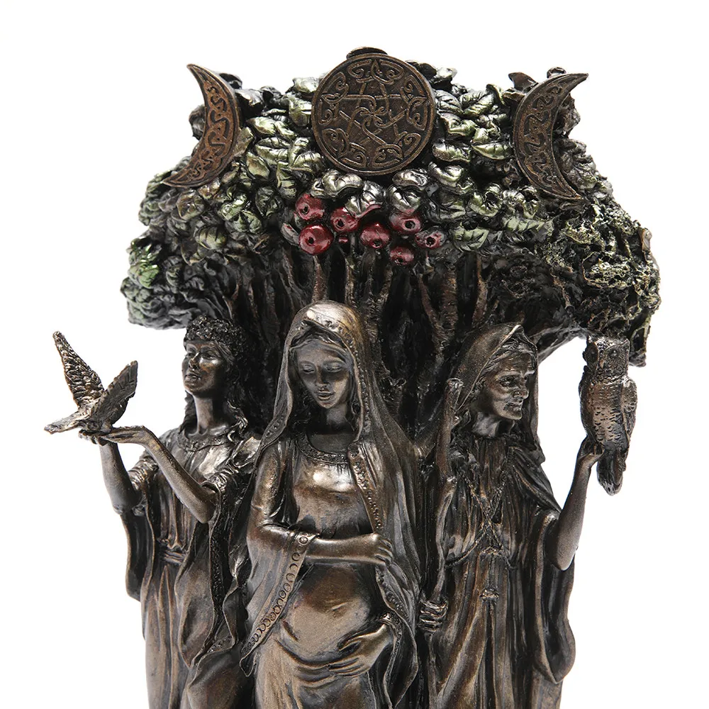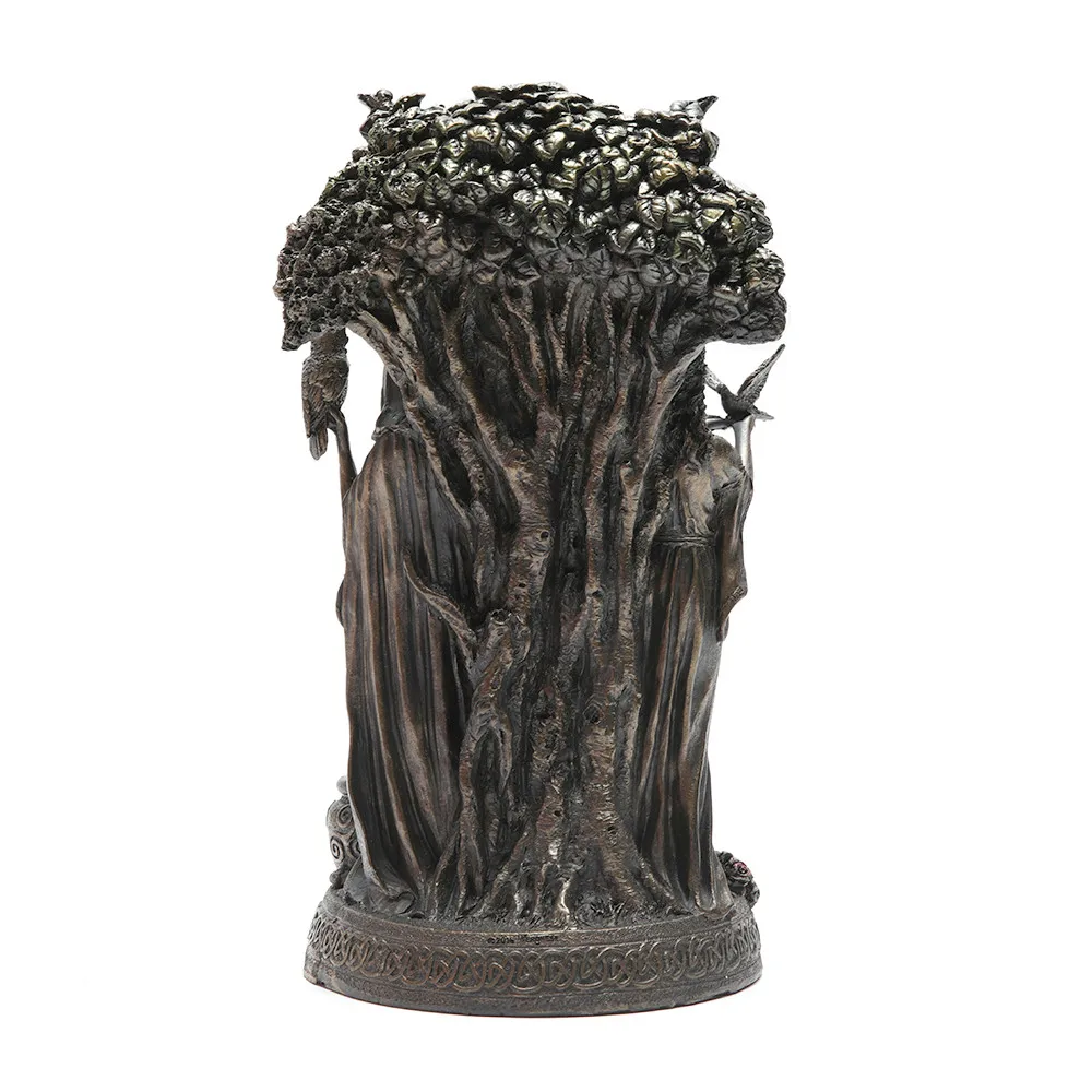 2. Впечатляюще детализированная статуя, изображающая тройную богиню, представляющая связь между божественной женщиной и естественным циклом, стоящим перед древом жизни