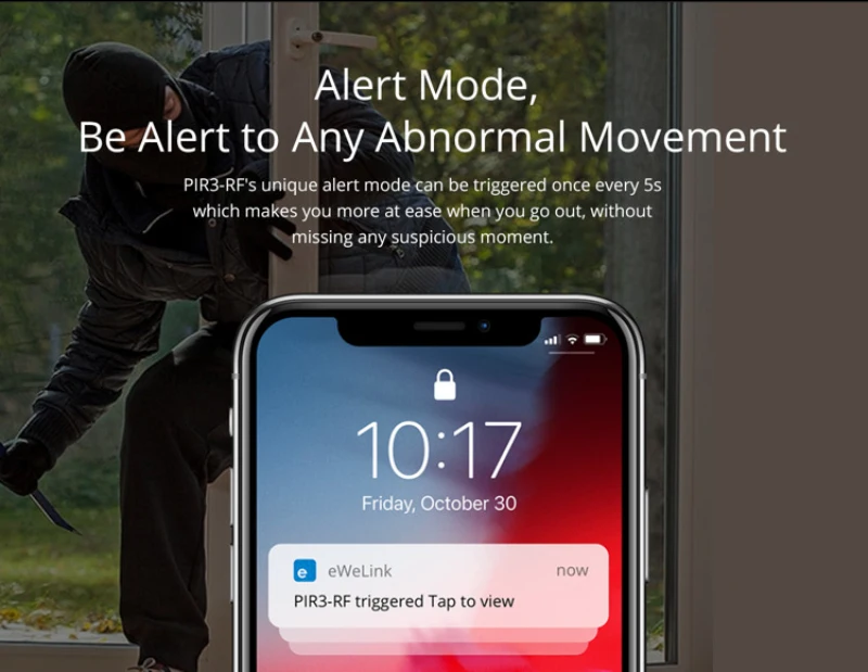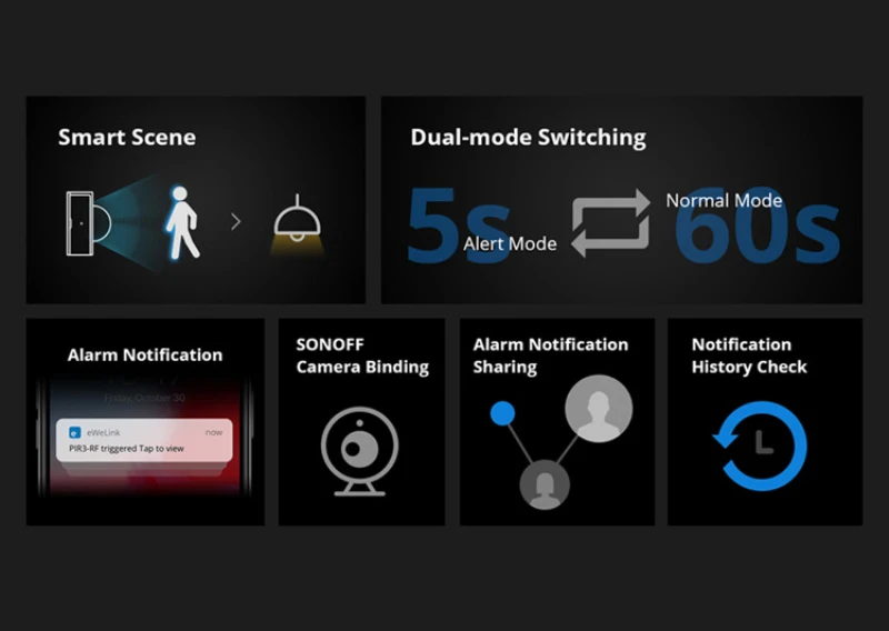 SONOFF PIR3-RF motion sensor can detect and report motion. When used for your home security system, it can detect the movement within 8M and help identify whether a human or pet is moving around inside your house, and your mobile phone will receive an alert notification. Connect SONOFF camera and you can view who is the intruder. When incorporated into your smart lifestyle, the sensor triggers your light on or off after connecting with SONOFF RF Bridge. You can set a scene that the hallway light is turned on when you enter the door.