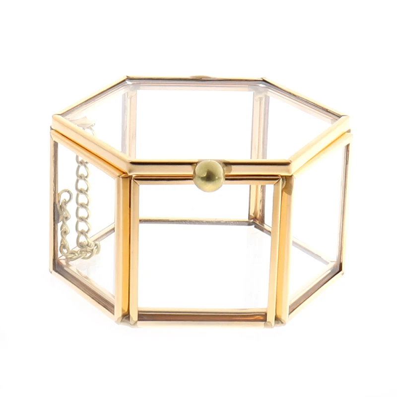 Настольная витрина с прозрачными стеклянными панелями и прочной латунной металлической рамкой.