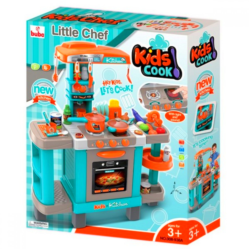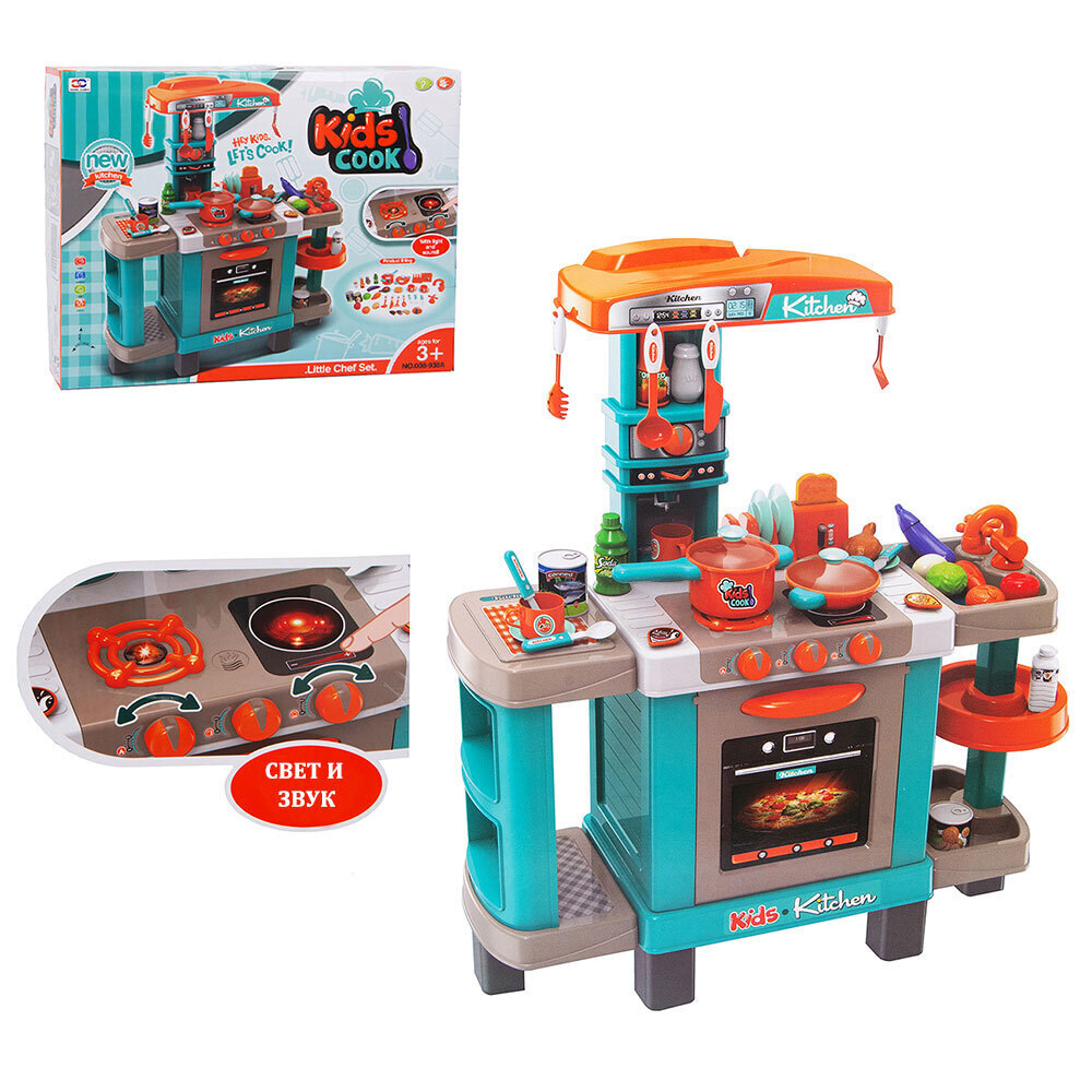 В состав набора входит: кухня, кастрюля с крышкой, сковорода с крышкой, вытяжка с тостером + тост, две чашки, 4 блюдца, кран, два ножа, ложка, вилка, шумовка, шпатель, половник, куриная ножка, соль, бутылка сока лайма, кетчуп, молоко, две банки, четыре овоща, фрукт, яйцо.