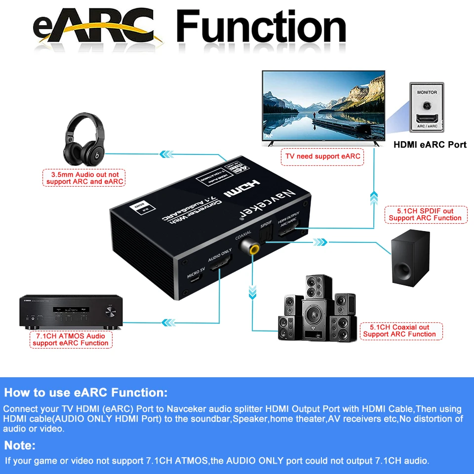 HDMI ARC/eARC Adapter - Extractor the Audio from IV to Soundbar or Amplifier .Connect your TV HDMI (ARC/eARC)Port to this switch HDMI Output Port with HDMI Cable ,then optical/Coaxial /HDMI cable to the soundbar ,Speaker ,home theater ,AV receivers etc ,then open “ARC/eARC” button.