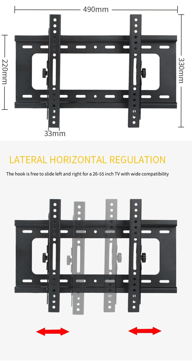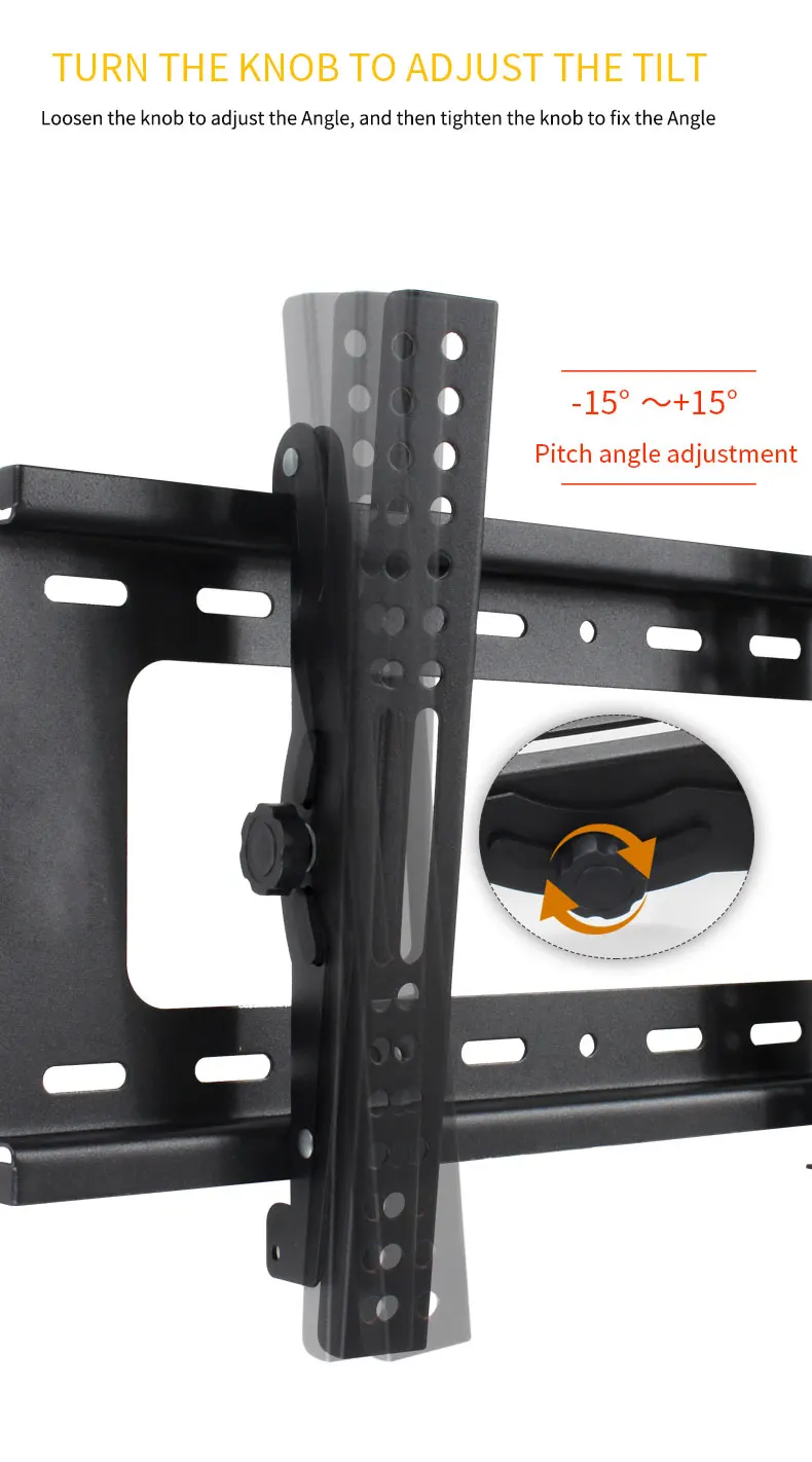 Размер телевизора: 26-55" Материал: холоднокатаная сталь Наклон вверх и вниз: -15 ~ + 15 ° Расстояние до стены: 68 мм Грузоподъемность: 50 кг (110 фунтов) Макс. VESA: 100*100 мм ~ 440*300 мм Способ установки: наклонКрепление для телевизора