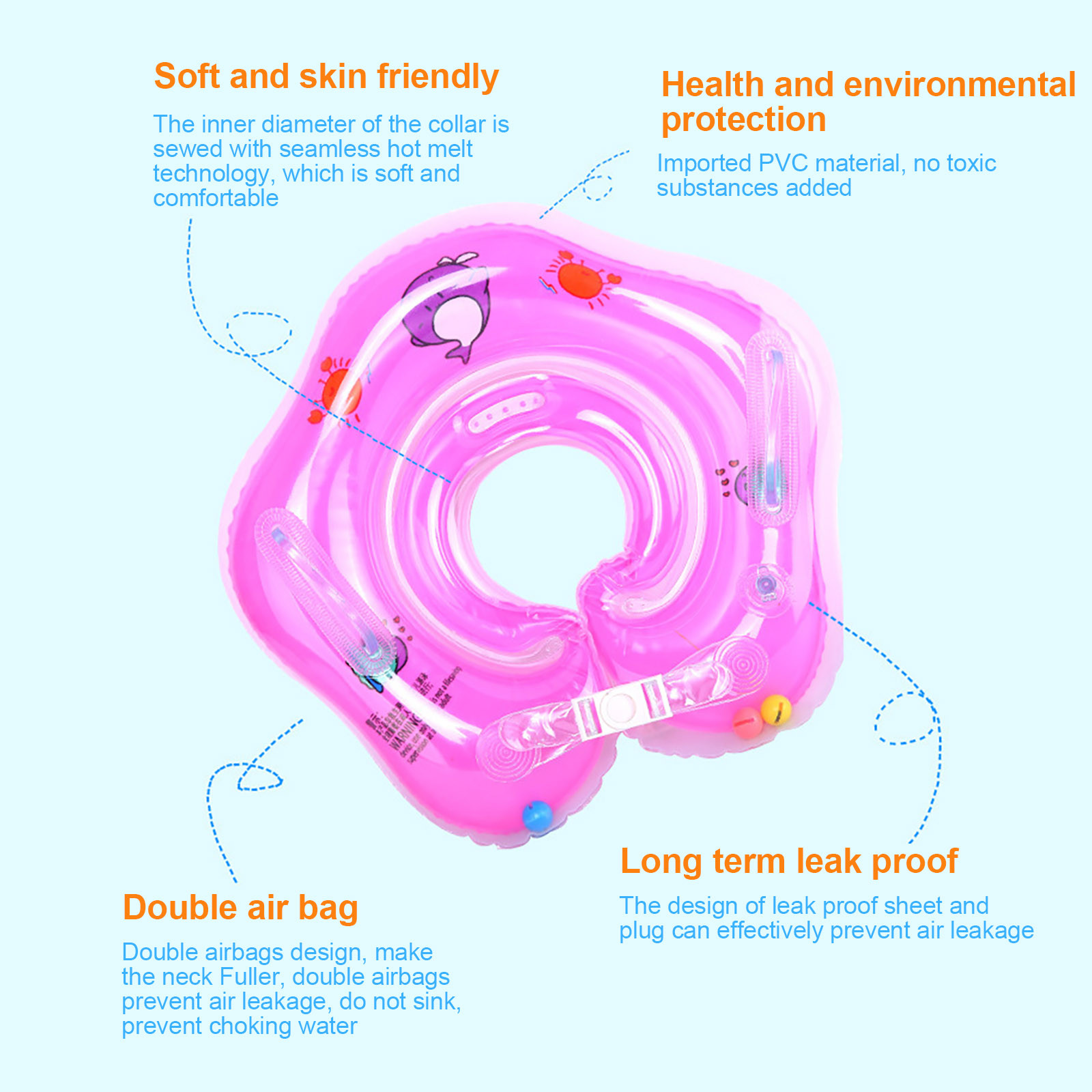 Материал: изготовлен из экологически чистого ПВХ, утолщенные двухслойные подушки безопасности не наносят вреда нежной коже ребенка, не беспокоясь о утечке воздуха или затухании; Обеспечивает безопасность и комфорт без деформации и выцветания.