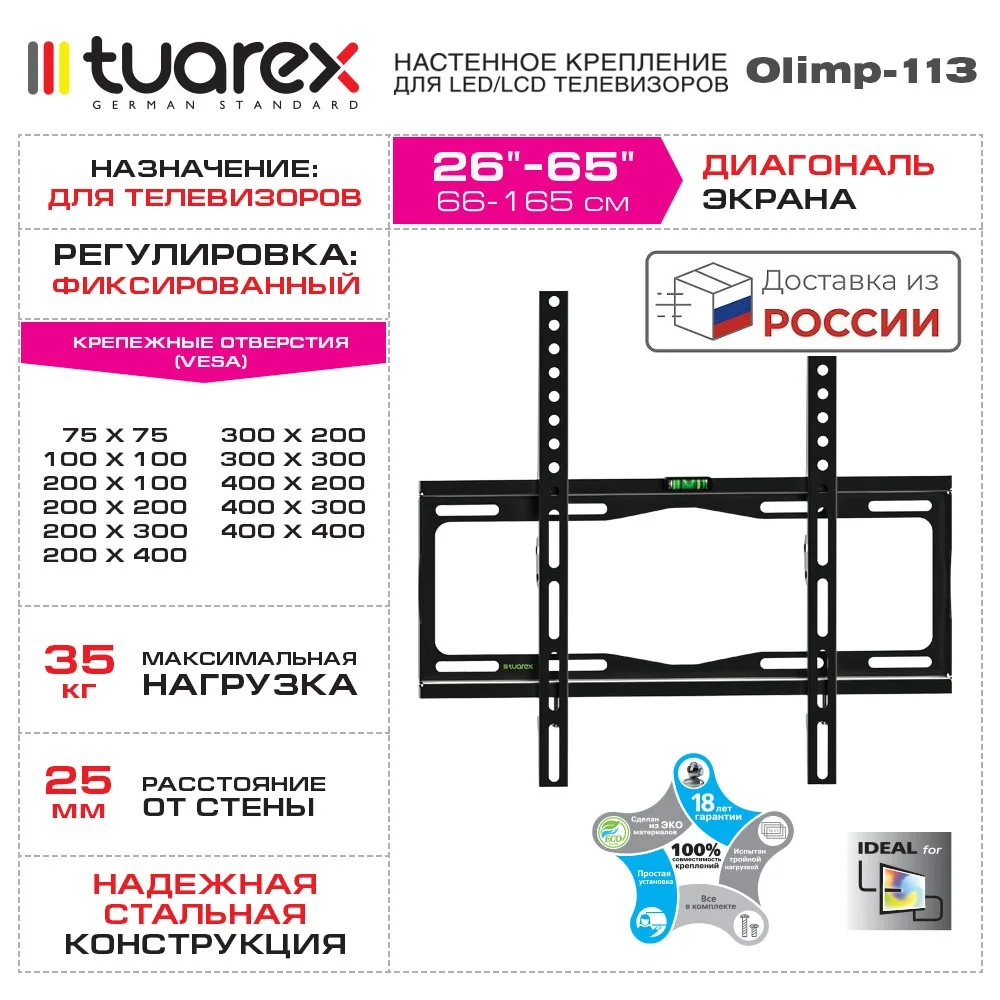 Удобный настенный кронштейн для LED/LCD телевизоров TUAREX OLIMP-113 BLACK надёжно удержит экран размером от 26"-65" дюйма и весом до 35 килограммов. Простая и интуитивно понятная конструкция настенного кронштейна для LED/LCD телевизоров TUAREX OLIMP-113 BLACK идеально подойдет для самостоятельного монтажа.