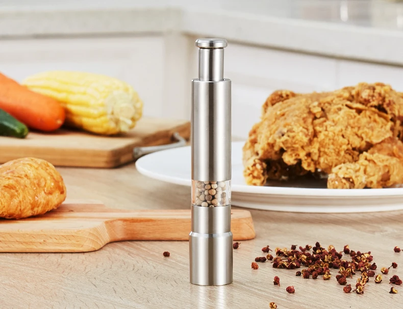 Этот набор мельниц для соли и перца оснащен удобной кнопкой для одного касания. Просто нажмите большим пальцем, чтобы получить ровный порошок!