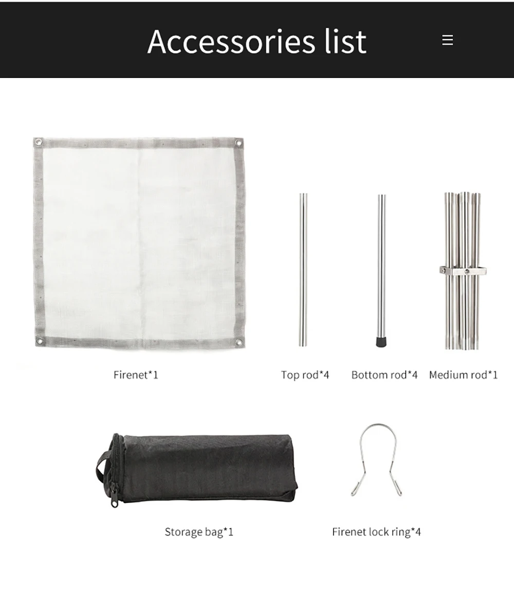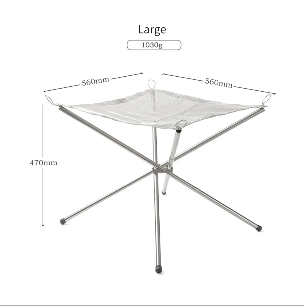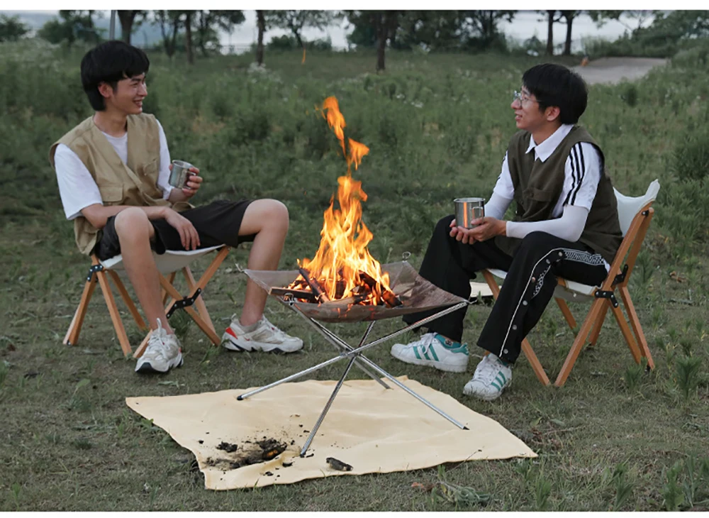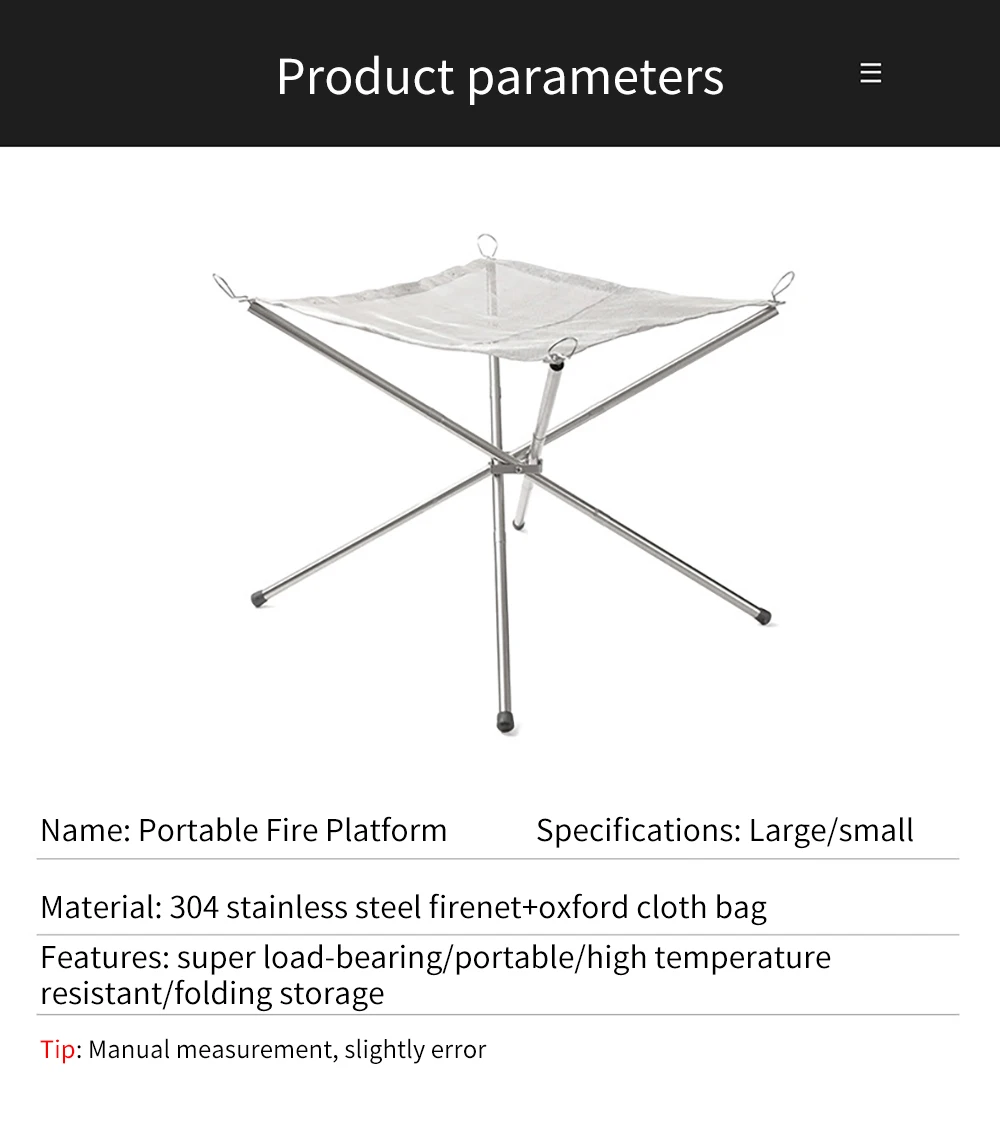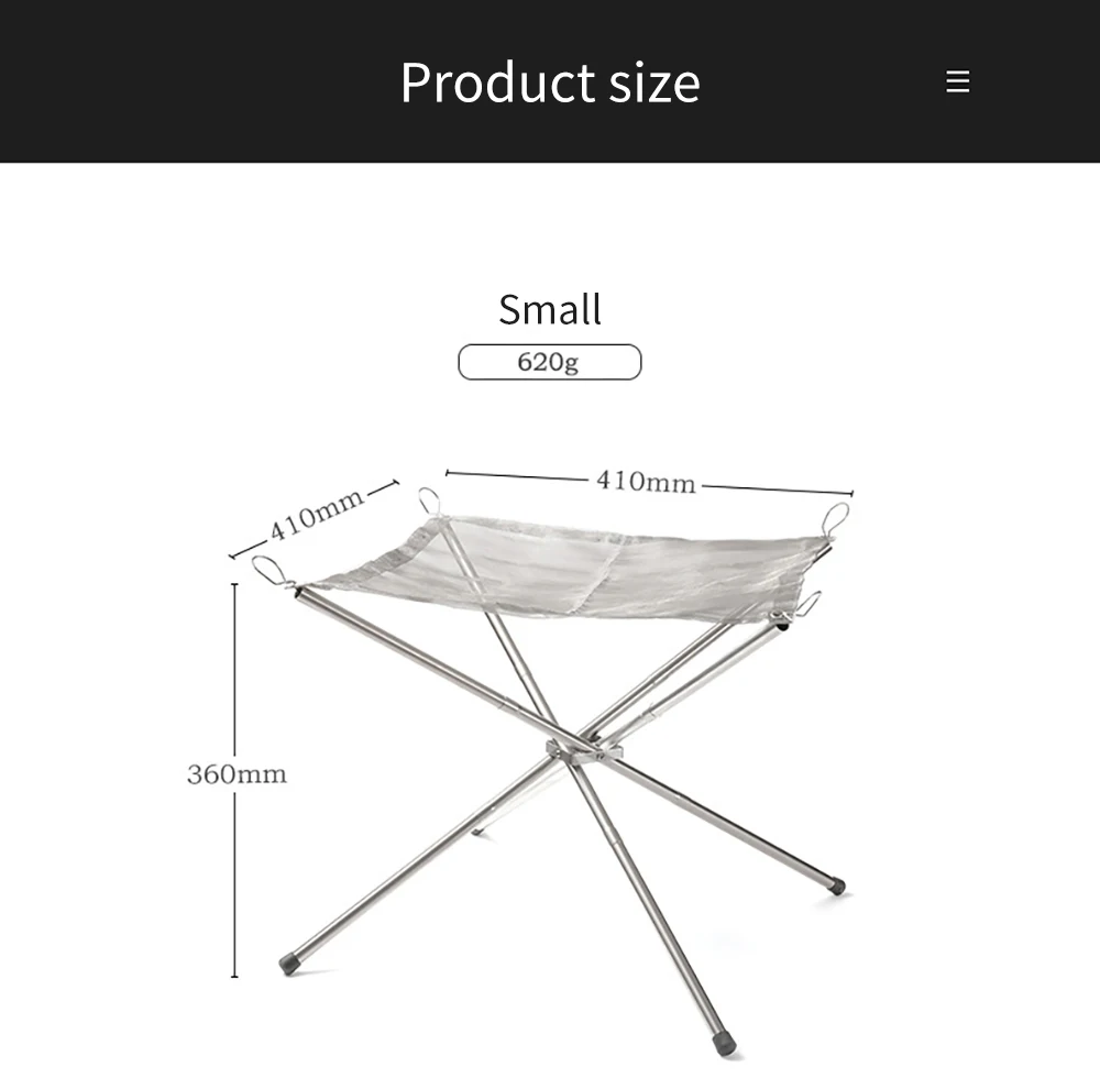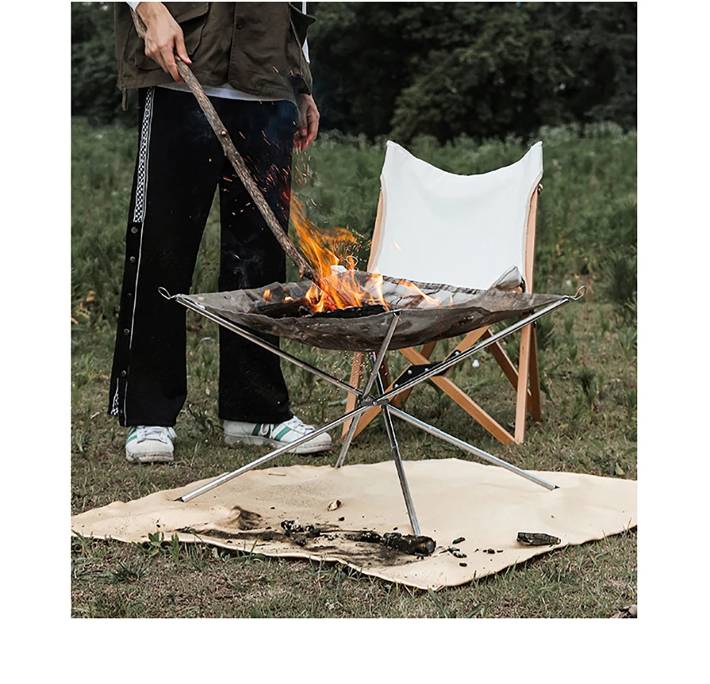2. Портативная и мощная Грузоподъемность: Эта пожарная яма имеет скручиваемую сетку из нержавеющей стали и складные ножки. Поперечная структура 4 труб из нержавеющей стали имеет фиксированную функцию, чтобы предотвратить наклон пожарной ямы. Грузоподъемность 5 кг.