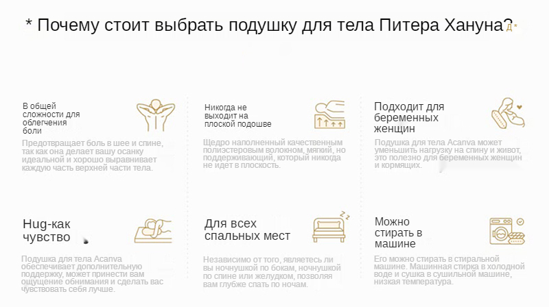 Многофункциональная подушка для тела-она особенно полезна для будущих мам и тех, у кого проблемы со сном, так как она соответствует различным позициям вашего тела и обеспечивает среднюю поддержку. Наша длинная подушка также обеспечивает хороший баланс между пушистостью и прочностью, что делает ее удобным выбором для всех.