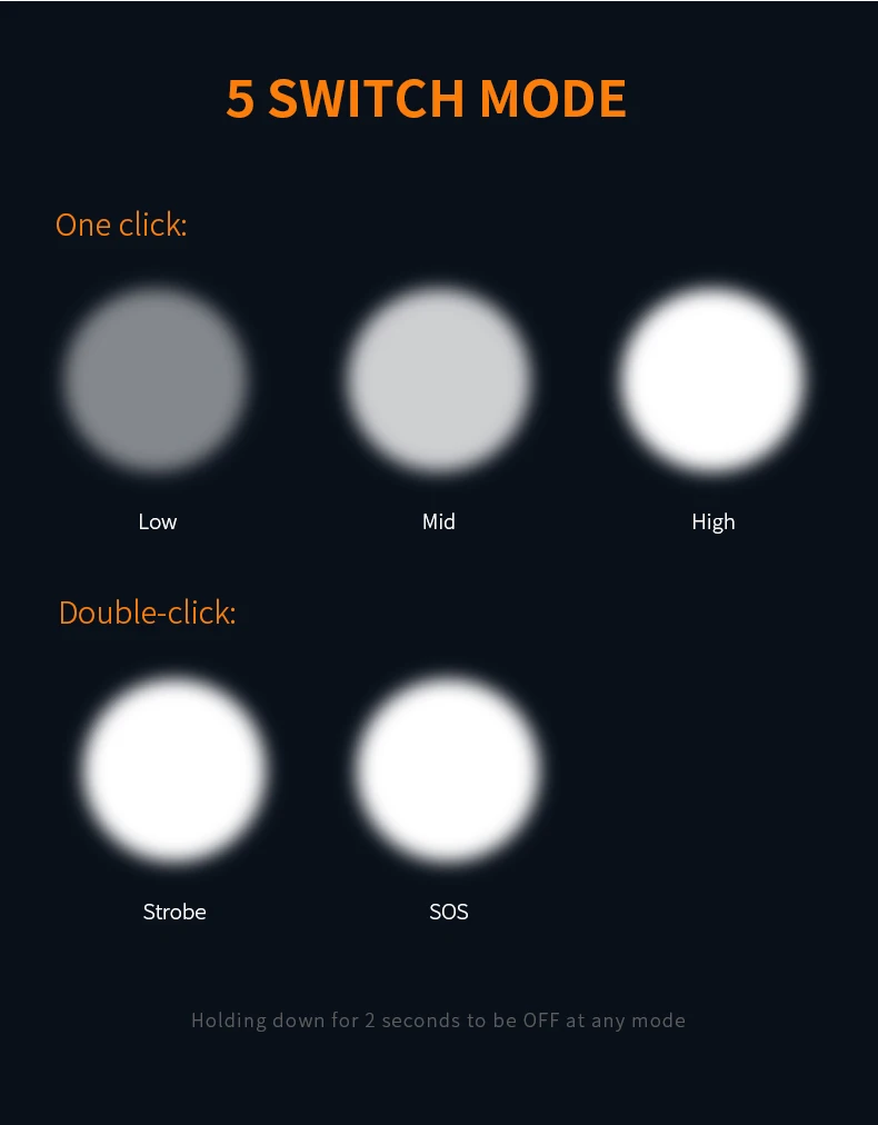 Легкий доступ к правильному выходу-Один прочный переключатель из нержавеющей стали для управления вкл/выкл, обеспечивает прямой доступ к низким, высоким и запоминающимся режимам, так что вы получите правильный светильник для задачи от близкого чтения до расстояния поиска. 3 режима ступенчатый светильник означает, что пользователи могут выбрать один из желаемых яркости между 300 и 3000 люменов. (Высокая-3000 люменов; Средняя-1000 люменов; Низкая-300 люменов)