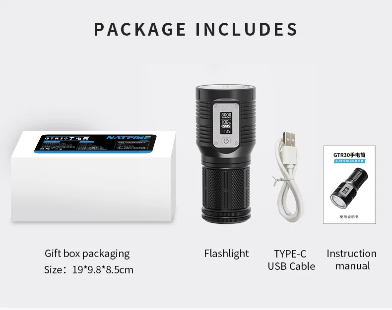 OLED оставайтесь в курсе-Больше не интересно, что происходит с вашим фонариком. Яркий, четкий oled-дисплей рядом с рамкой GTR30 сообщает важную информацию, такую как текущий выход, оставшееся время работы и уровень заряда батареи.