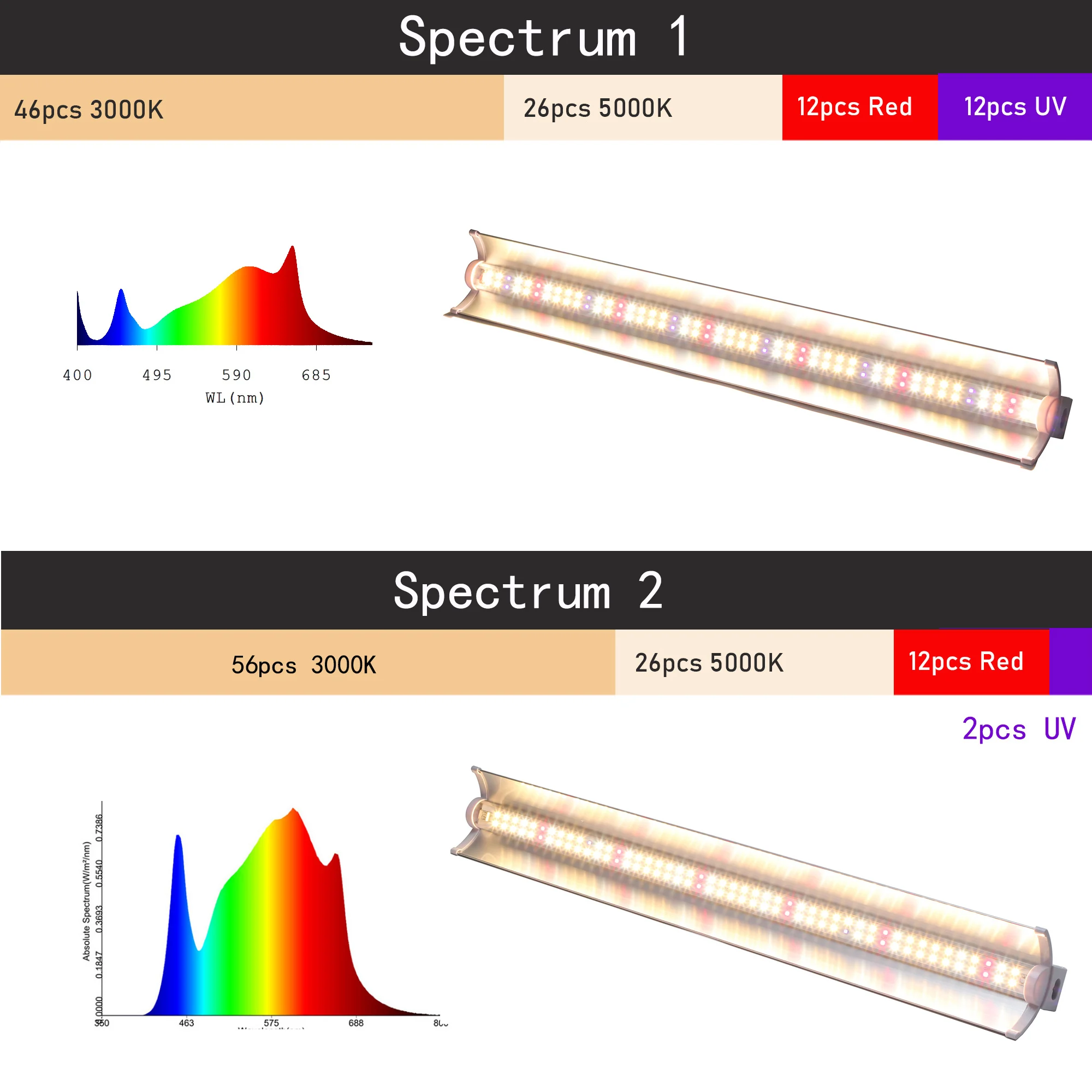【Дополнительно полный спектр 】 (спектр 1)- 46 шт. 3000K светодиодный, 26 шт. 5000K светодиодный, смешанный 12 шт. красный (660нм) и 12 шт. УФ (395нм) которые создают полный спектр и охватывают весь процесс роста растений от прорастания до цветения и плодоношения. (Спектр 2) - 56 шт. 3000 К + 26 шт. 5000 К + 1 2 шт. красный + 2 шт. УФ